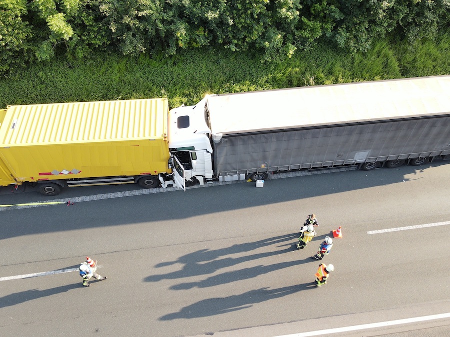 Nach ersten Erkenntnissen war ein LKW am Stauende auf einen anderen aufgefahren. Das Führerhaus verkeilte sich unter dem Anhänger des vorausfahrenden Fahrzeugs. Der nachfolgende Laster verlor größere Mengen Diesel, aus dem Motorblock drang Rauch.