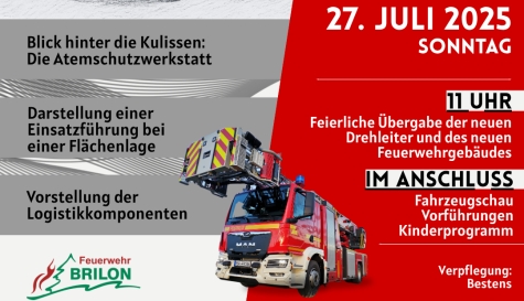 BRILON. Ein besonderer Tag steht der Freiwilligen Feuerwehr Brilon bevor: Am Sonntag, 27. Juli 2025, werden die neue Drehleiter und das neu errichtete Feuerwehrgerätehaus offiziell eingeweiht. Aus diesem Anlass lädt die Feuerwehr alle Bürgerinnen und Bürger herzlich zum „Tag der offenen Tore“ ein.