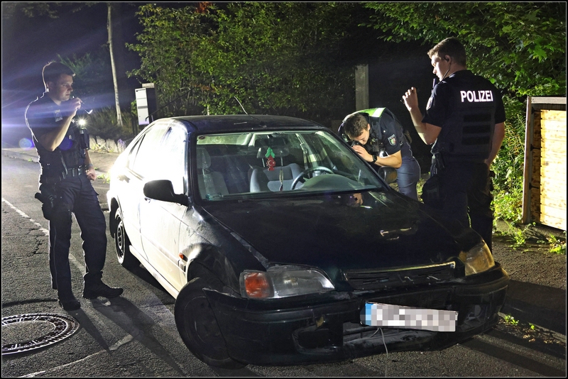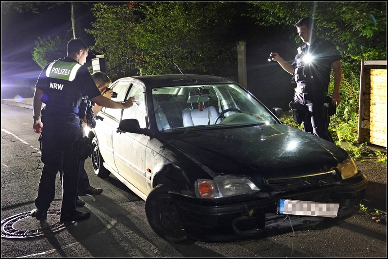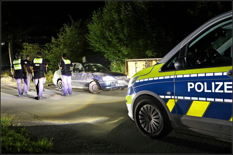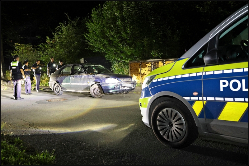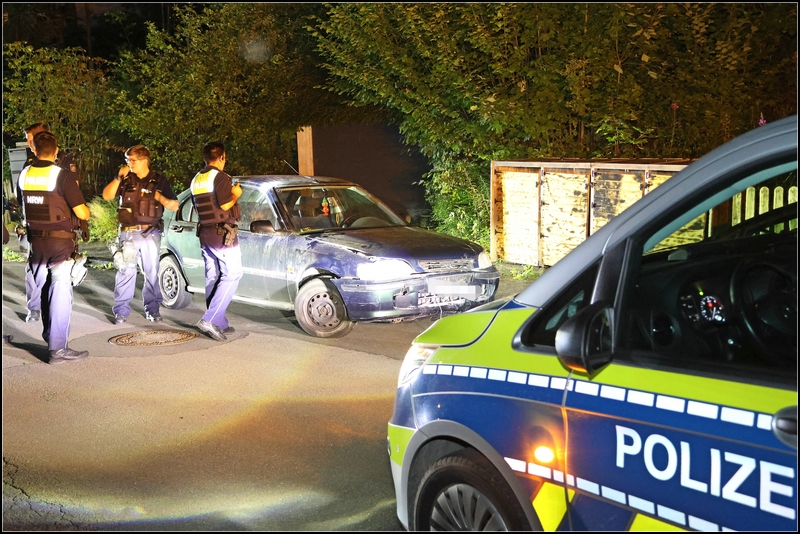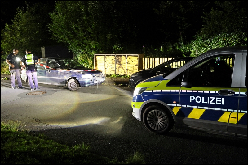 Anwohner hatten den Unfall gehört und umgehend die Polizei alarmiert. Mit mehreren Streifenwagen machten die Polizeibeamten sich sofort auf den Weg. Eine mehrere Meter lange Bremsspur zeigte den Beamten die Fahrtrichtung des flüchtigen Wagens an. Wenige Minuten später konnten Streifenwagen das gesuchte Fahrzeug in der Nähe ausfindig machen, vom Fahrer fehlte jedoch zunächst jede Spur. Am Fahrzeug, das die Polizeibeamten antrafen, war die Front erheblich beschädigt, das Dach wies Kratzspuren vom Stacheldraht des beschädigten Zaunes auf, die Vorderachse schien vom Aufprall gebrochen zu sein. An dem Fahrzeug wurden Unfallspuren gesichert, die auch einen Nachweis auf den möglichen Fahrer erbringen sollen.
