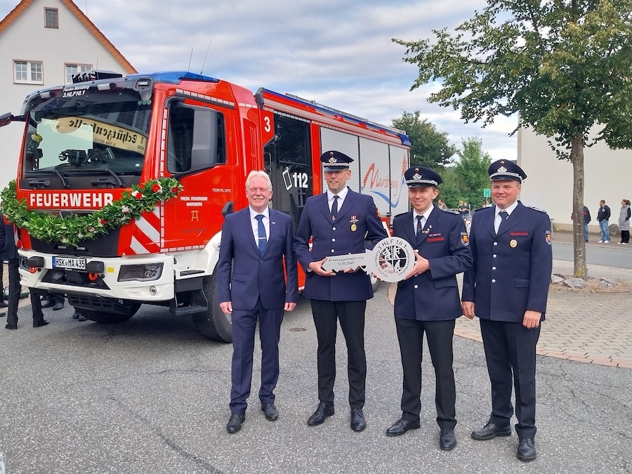 Im Anschluss übergab Bürgermeister Schröder den symbolischen Schlüssel an Wehrleiter Cyrill Stute, der ihn sodann an Löschgruppenführer Jörg Prior weitergab – damit war das Fahrzeug offiziell in Dienst gestellt. Prior schloss sich den Dankesworten an und ließ den Beschaffungsprozess kurz Revue passieren, der bereits 2019 durch das Projektteam begonnen habe. Nachdem Ende Mai 2025 das Fahrzeug vom Hersteller Rosenbauer abgeholt werden konnte, habe sich die Löschgruppe durch intensiven Übungsdienst und Schulungen mit dem Fahrzeug vertraut gemacht, sodass es seit August im Einsatzdienst steht. In diesem Zusammenhang dankte Prior Dachdeckermeister Thomas Dicke und der Firma Elektro Geise dafür, dass das Fahrzeug in deren Betriebshallen untergestellt werden konnte: Das neue Gerätehaus in Westheim befindet sich noch im Bau; aktuell rückt die Löschgruppe von der Firma Geise zu Einsätzen aus.