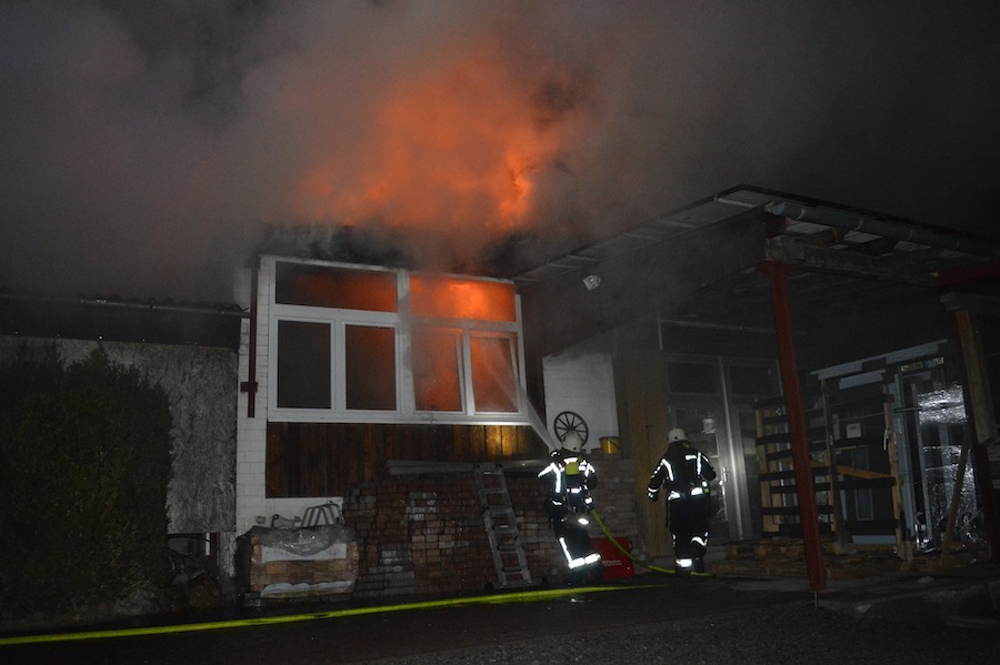 Gegen 20.15 Uhr bemerkte eine Anwohnerin in der Bergstraße einen Brand und verständigte die Feuerwehr; die Alarmierung erfolgte gegen 20.30 Uhr, wie die Feuerwehr mitteilt. Beim Eintreffen war massive Rauchentwicklung und deutlicher Feuerschein aus dem Werkstattgebäude sichtbar; die Einsatzfahrzeuge positionierten sich, die Drehleiter wurde in der Einfahrt der Firma in Stellung gebracht, und ein Löschangriff mit mehreren Strahlrohren aufgebaut.