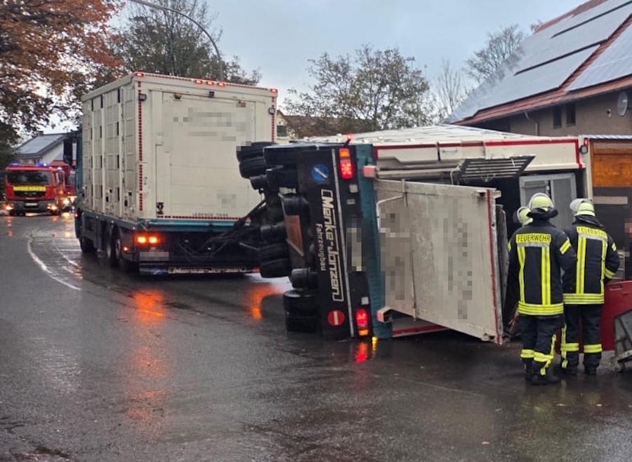 BAD WÜNNENBERG. In Helmern ist ein Schweinetransporter mit Anhänger verunglückt; rund 90 Tiere waren betroffen.