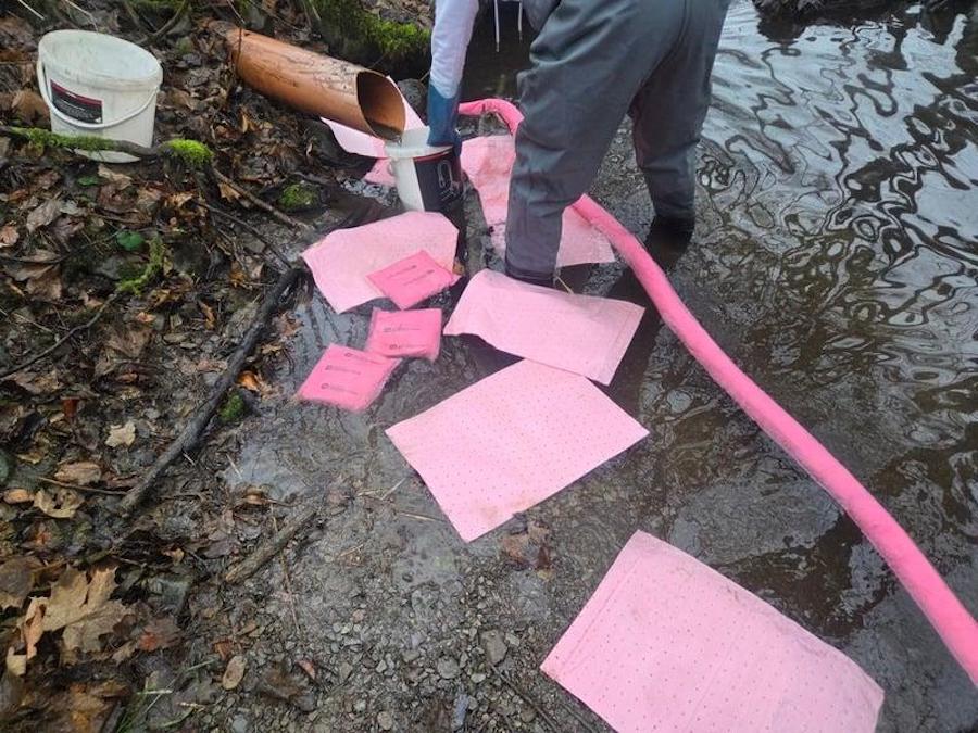 Parallel zu diesem Einsatz wurden am Samstag um 13:24 Uhr die Löschgruppen Hoppecke und Messinghausen zu einer Gewässerverunreinigung auf der Hoppecke alarmiert. Vor Ort stellten die Einsatzkräfte Ölschlieren auf dem Gewässer sowie einen deutlichen Heizöl- bzw. Dieselgeruch fest. Bei der Erkundung wurde im Industriegebiet „Im Lies" ein Abflussrohr entdeckt, aus dem Heizöl austrat. Ursache war ein undichter, frisch betankter Heizöltank, aus dem das Öl über die Regenwasserkanalisation in den Fluss gelangt war.