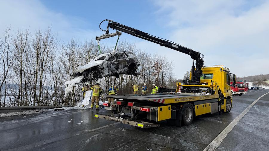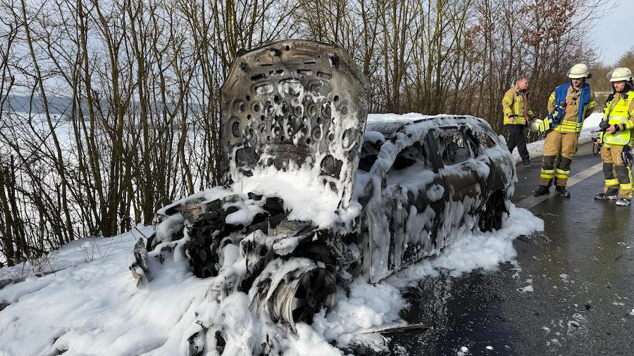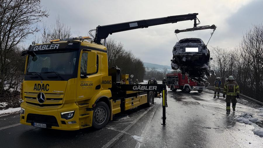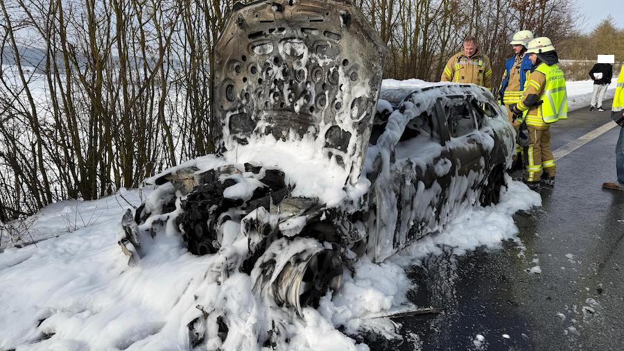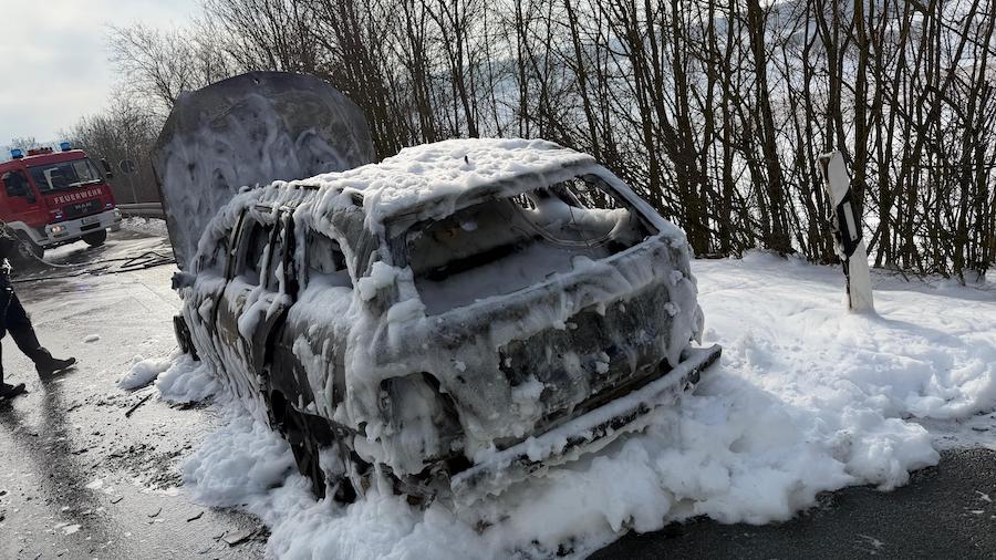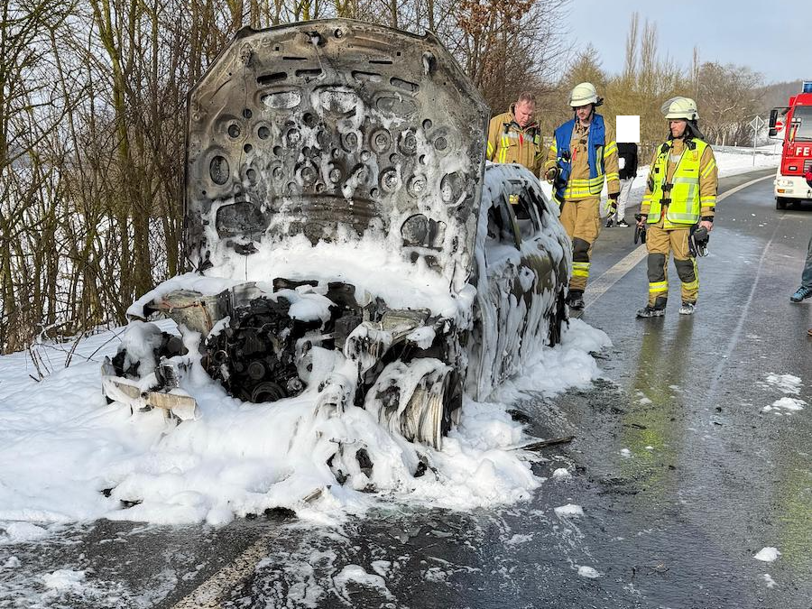 Vorgefunden wurde der Pkw beim Eintreffen der Einsatzkräfte bereits in Vollbrand. Trotz der sofort eingeleiteten Löschmaßnahmen brannte das Fahrzeug vollständig aus. Erforderlich war für die Dauer der Arbeiten eine Vollsperrung der betroffenen Strecke. Verletzt wurde glücklicherweise niemand. Auf einen vierstelligen Eurobetrag wird der Gesamtsachschaden geschätzt.