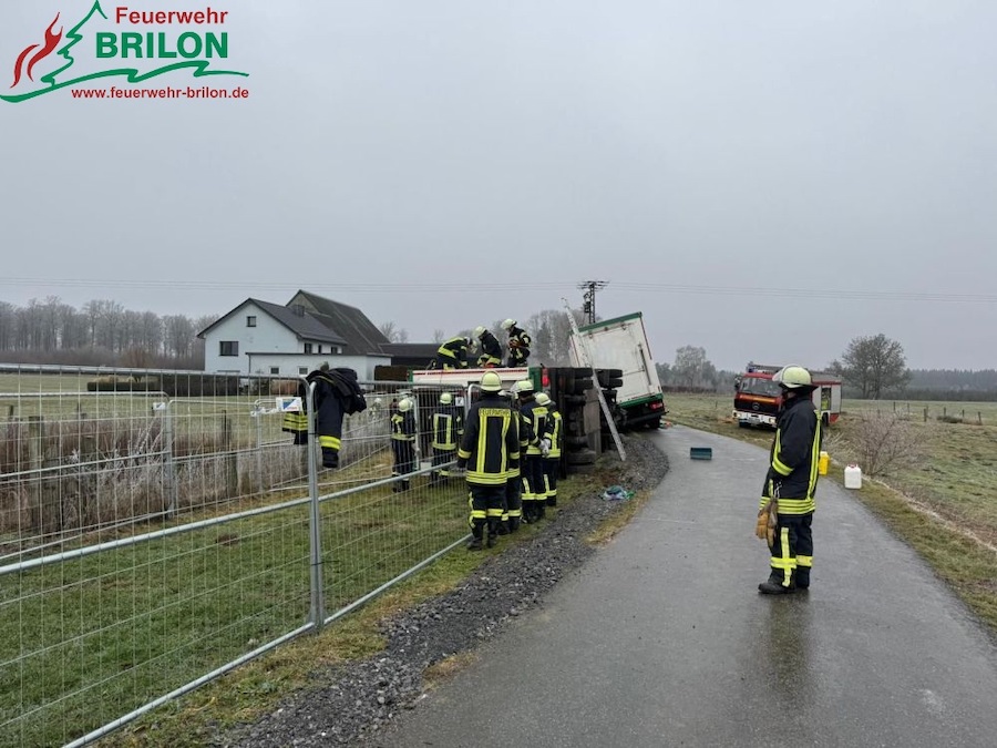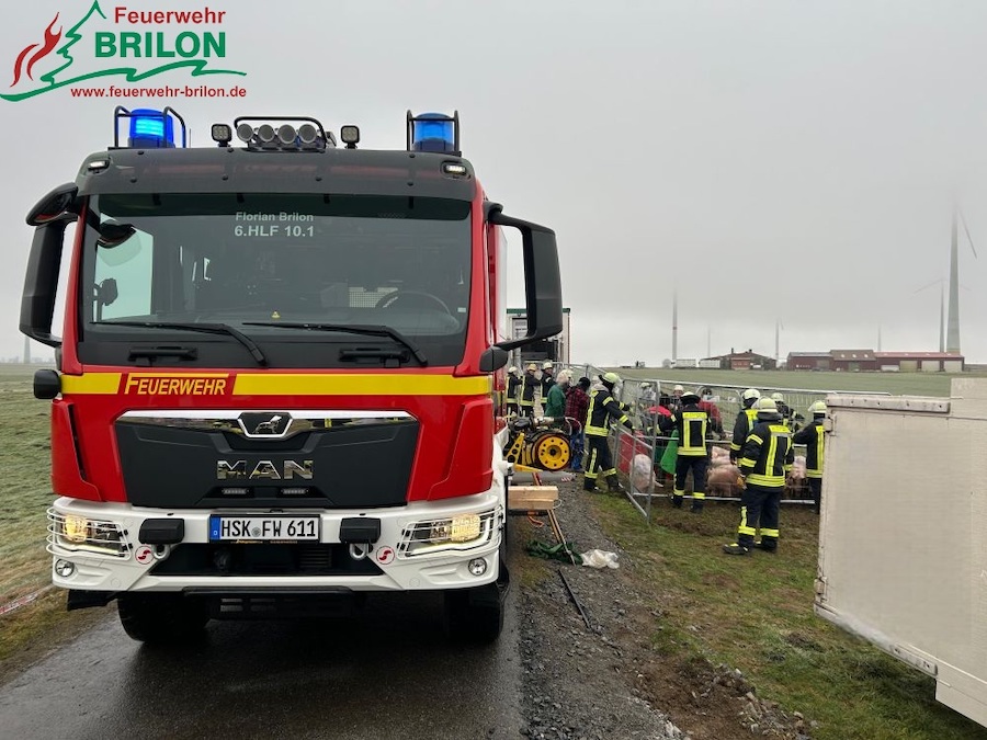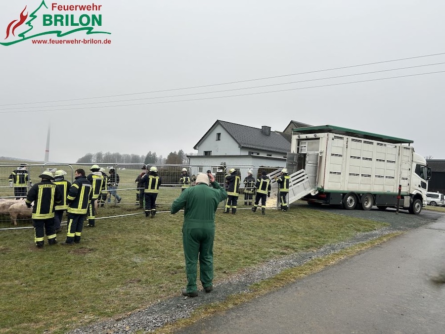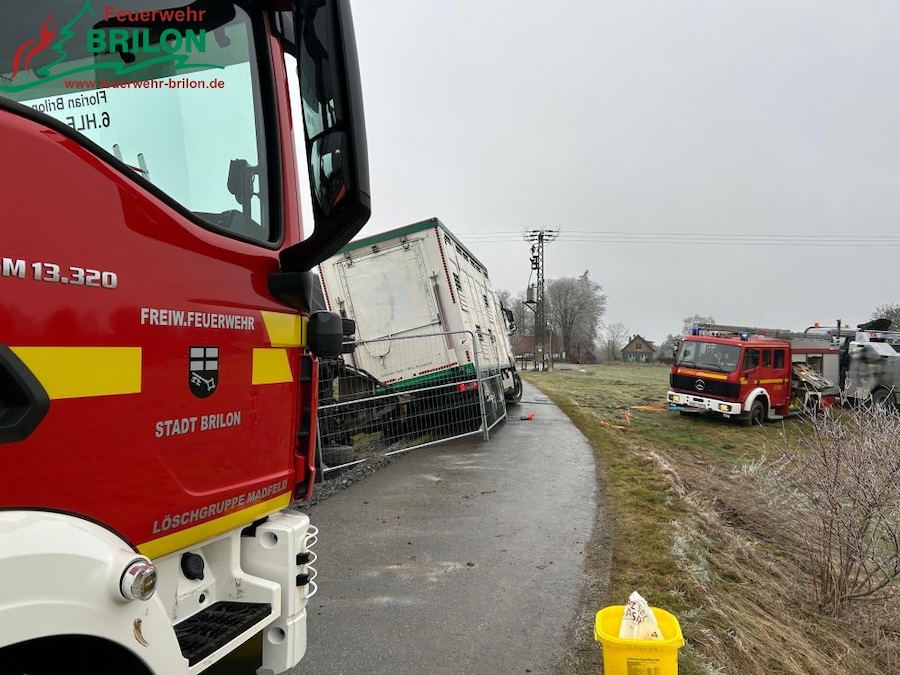 Am Samstag erfolgte um 10.58 Uhr die Alarmierung der Löschgruppe Madfeld zu der Unfallstelle. Nach dem Eintreffen stellte sich heraus, dass der Anhänger vollständig umgekippt war und sich nicht mehr öffnen ließ, wodurch alle Tiere im Inneren eingeschlossen waren. Kräfte der Feuerwehr sicherten die Örtlichkeit ab und streuten die Fahrbahn aufgrund von Glatteis mit Salz. Zur Vermeidung weiterer Gefahren wurde das Gespann stabilisiert. Während Rettungsdienst und Polizei den unter Schock stehenden Fahrer versorgten, forderte die Einsatzleitung die Löschgruppe Alme zur Unterstützung nach. Ein Landwirt unterstützte die Maßnahmen mit einem Traktor sowie mobilen Zäunen.