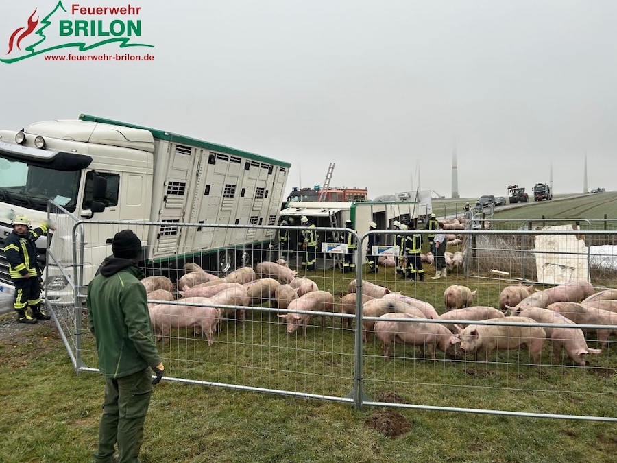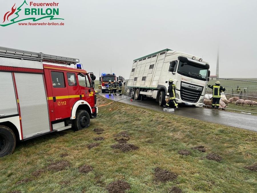 BRILON. Auf einem schmalen Feldweg im Bereich „Loh“ im Ortsteil Alme verunglückte ein dreistöckiger Lastkraftwagenanhänger, der mit 80 Schweinen beladen war.