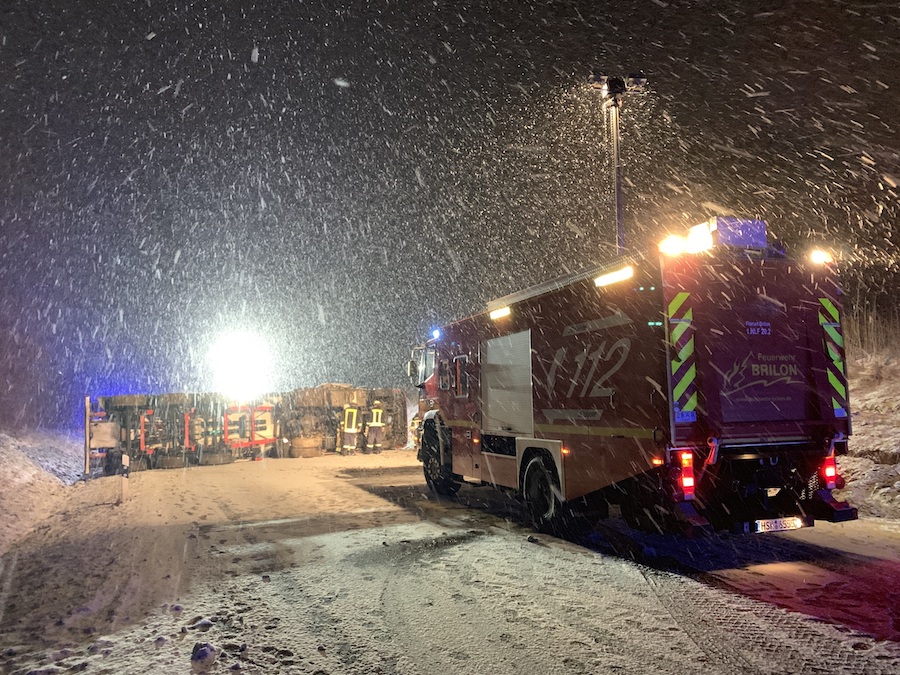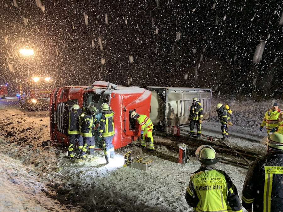 BRILON. Ein mit Leim beladener Sattelzug ist auf der B 7 zwischen dem Abzweig Scharfenberg und dem Kreisverkehr Möhnestraße umgestürzt und hat die Fahrbahn blockiert. Am Montag um 1.09 Uhr wurden Einsatzkräfte der Feuerwehr zu dem Verkehrsunfall gerufen.