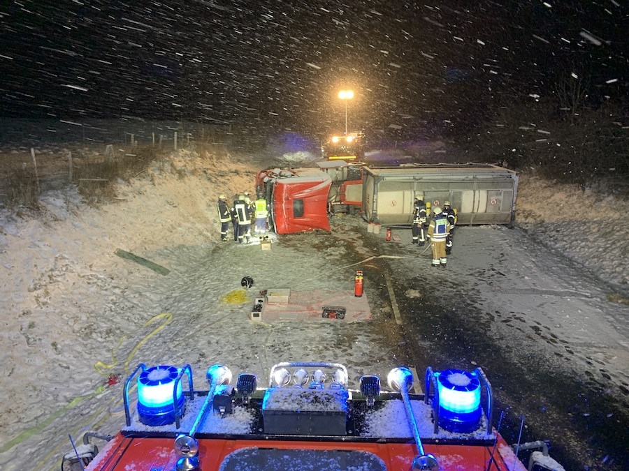 In einer Rechtskurve war der Lastwagen von der Straße abgekommen, in die Böschung gerutscht und umgestürzt. Der Sattelzug blieb anschließend quer auf der Fahrbahn liegen.