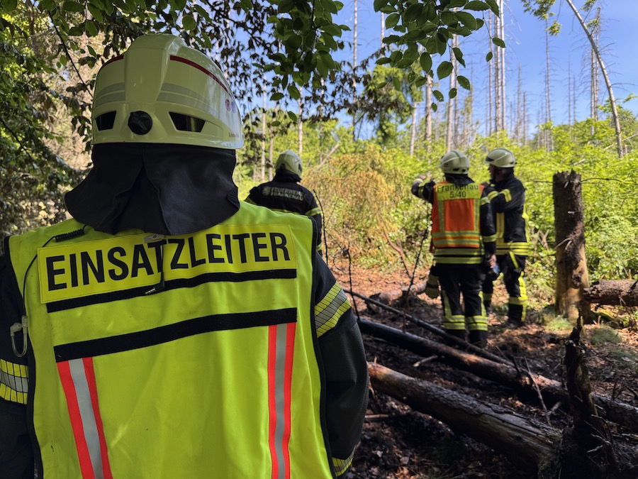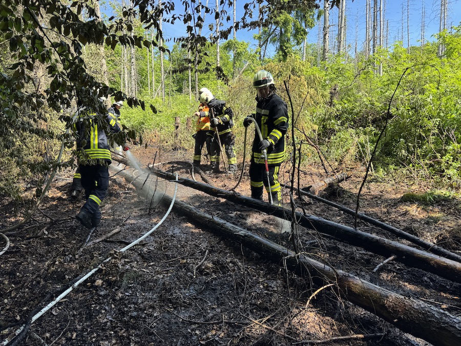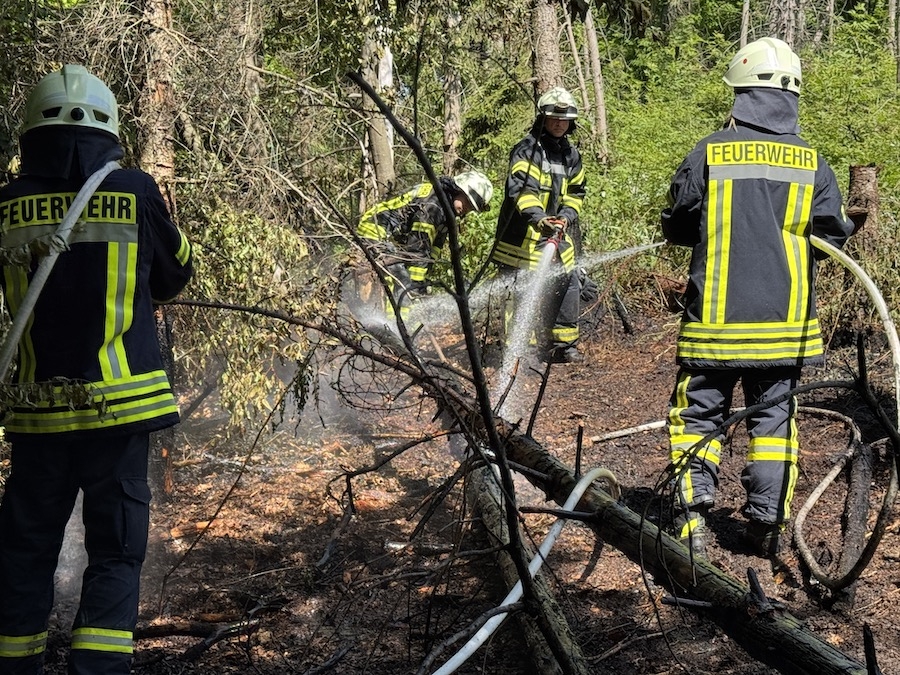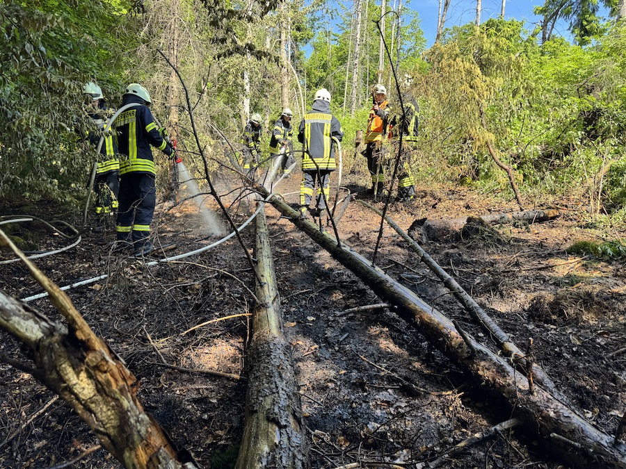 Vor Ort brannten drei Baumstämme sowie Waldboden im betroffenen Bereich. Die Flammen wurden unter der Einsatzleitung von Stadtbrandinspektor Andre Hesselbein mit mehreren D-Rohren gelöscht. Schlimmeres konnte verhindert werden. Anschließend kontrollierten die Einsatzkräfte die Fläche mit einer Wärmebildkamera, um ein Wiederaufflammen auszuschließen.