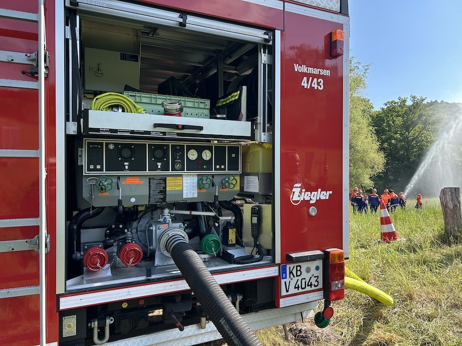 Nach der Begrüßung durch die Leitung der Stadtjugendfeuerwehr ertönte bereits um 18 Uhr der erste Alarm: Drei parallele Einsatzübungen standen auf dem Programm – eine Schachtrettung bei der Firma Raulf in Külte, ein Schaumangriff bei der Firma Kumpe in Volkmarsen sowie ein Wasserwerfereinsatz am Hochwasserschutzdamm in Ehringen. Gegen 21 Uhr wurden diese Szenarien erneut bei Dunkelheit geübt.