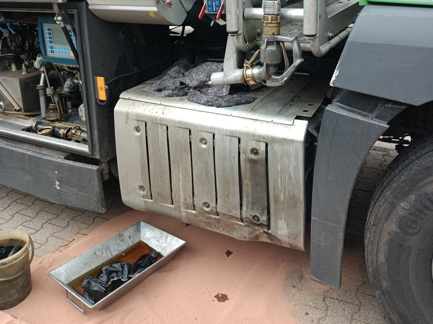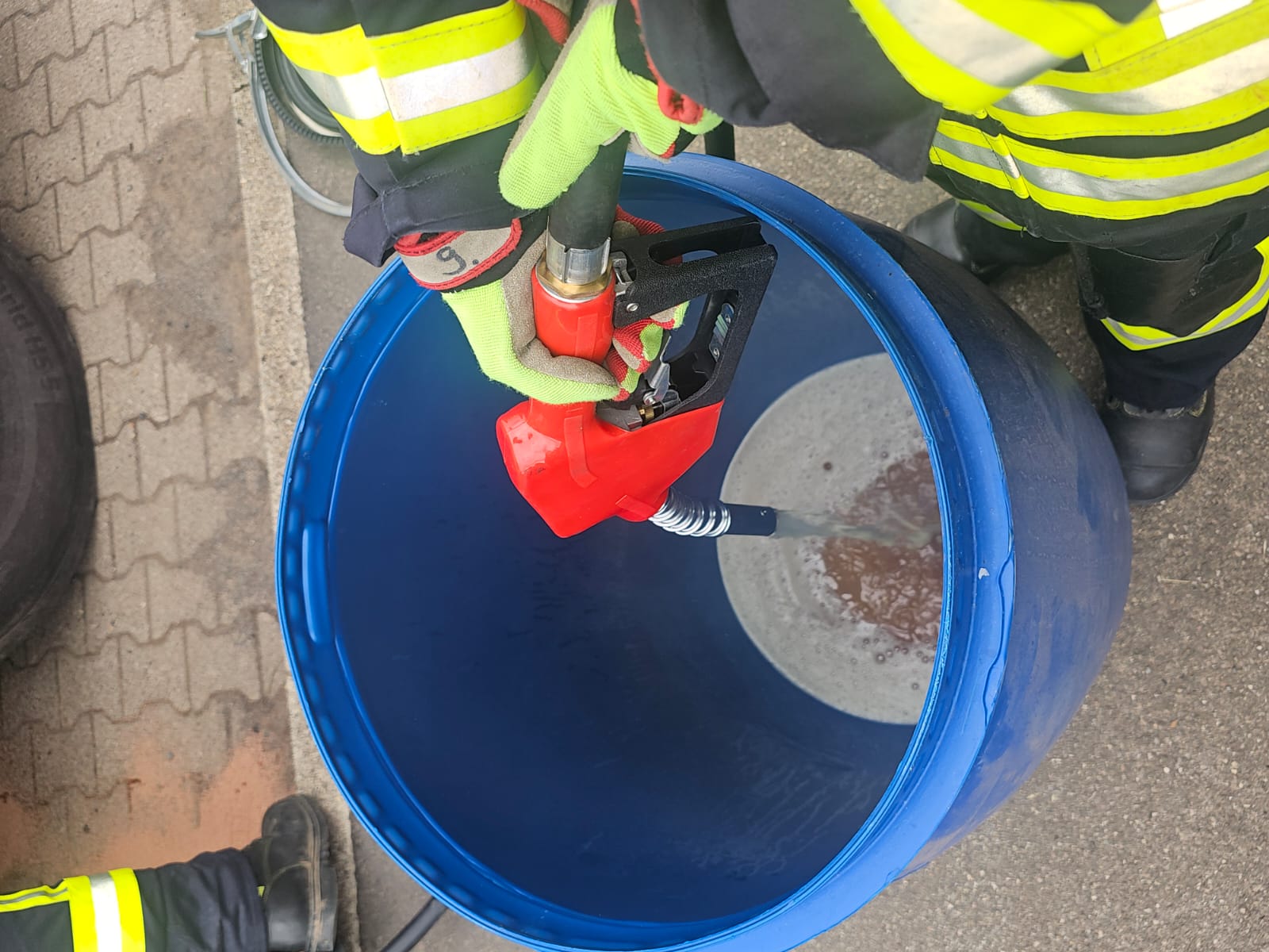 Die Einsatzkräfte wurden am Donnerstag, 5. Juni, gegen 14.10 Uhr mit dem Stichwort „HGEFAHR 1 – Gefahrstoffaustritt, Additiv läuft aus – ca. 30 Liter“ alarmiert.
