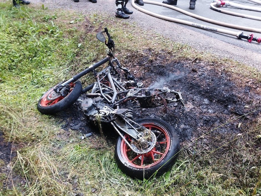 Das Motorrad geriet nach dem Sturz in Brand. Die Feuerwehren der Nationalparkgemeinde Vöhl wurden alarmiert und konnten den Brand unter Atemschutz löschen. Eine Rauchsäule war bereits auf der Anfahrt sichtbar.
