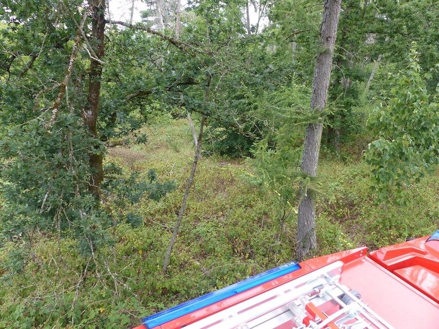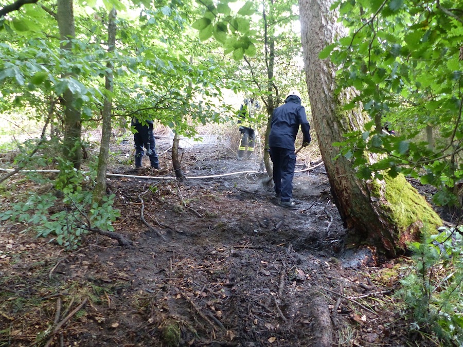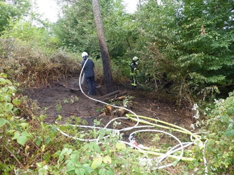 Etwa 450 Meter vom Parkplatz entfernt brannten rund 100 Quadratmeter Waldboden im Unterholz. Die Feuerwehr brachte den Brand zunächst mit einem C-Rohr, anschließend mit zwei D-Rohren unter Kontrolle und löschte ihn vollständig ab. Zudem wurde der Waldboden mit verschiedenen Handwerkzeugen mechanisch aufgelockert, um versteckte Glutnester aufzuspüren.