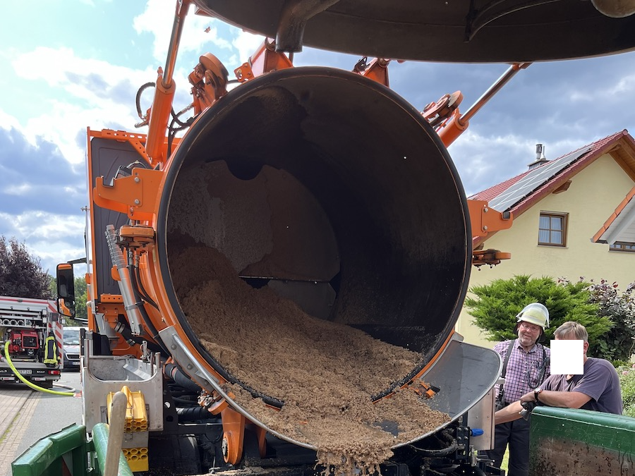 Ein Trupp unter Atemschutz öffnete vorsichtig die Klappe des Pelletbunkers. Herausfallendes Material wurde direkt befeuchtet und anschließend mit einem Saugschlauch in den Tank des Saugwagens abgesaugt. Dieser war mit etwas Wasser gefüllt worden, um mögliche Glutreste bereits während des Absaugens zu kühlen. Anschließend wurde das Material in den Container entleert und einer fachgerechten Entsorgung zugeführt.