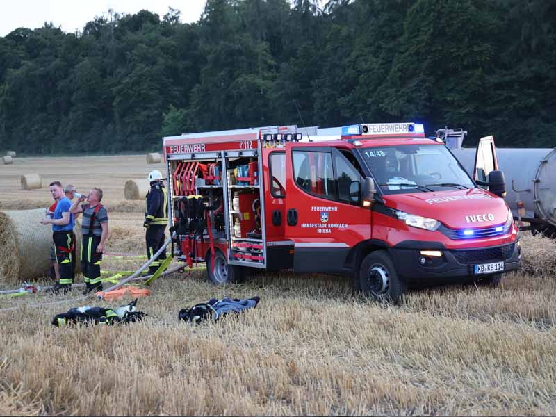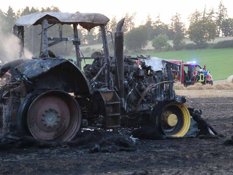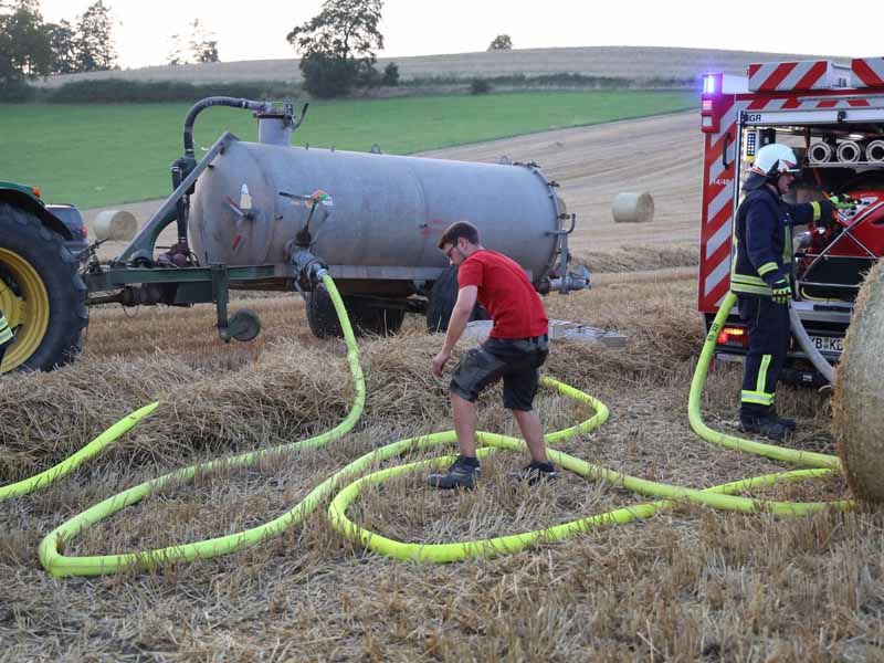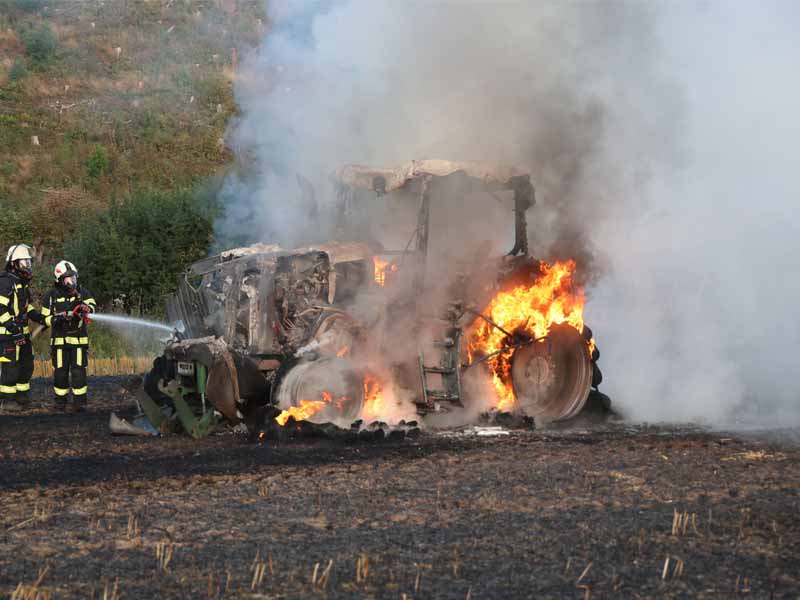 Nach Angaben von Stadtbrandinspektor Carsten Vahland war ein landwirtschaftliches Gespann bei der Feldarbeit in der Gemarkung zwischen Rhena und Lelbach in Brand geraten. Eine große, tiefschwarze Rauchwolke wies den Einsatzkräften bereits von Weitem den Weg. Bei Eintreffen der ersten Kräfte stand das Gespann aus Traktor und Rundballenpresse bereits im Vollbrand. Das Feuer hatte auch auf das abgeerntete Feld und die Strohschwaden und einzelne Rundballen übergriffen. Unverzüglich leiteten die ehrenamtlichen Einsatzkräfte Maßnahmen ein, um eine weitere Ausbreitung zu vermeiden.