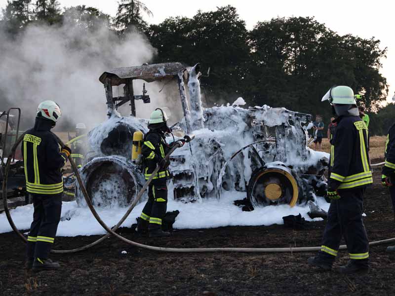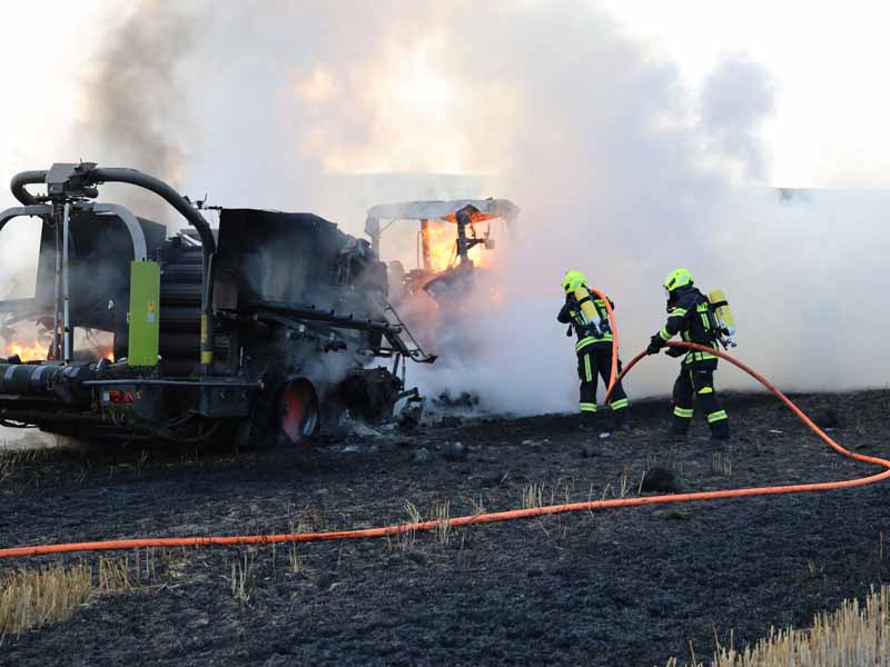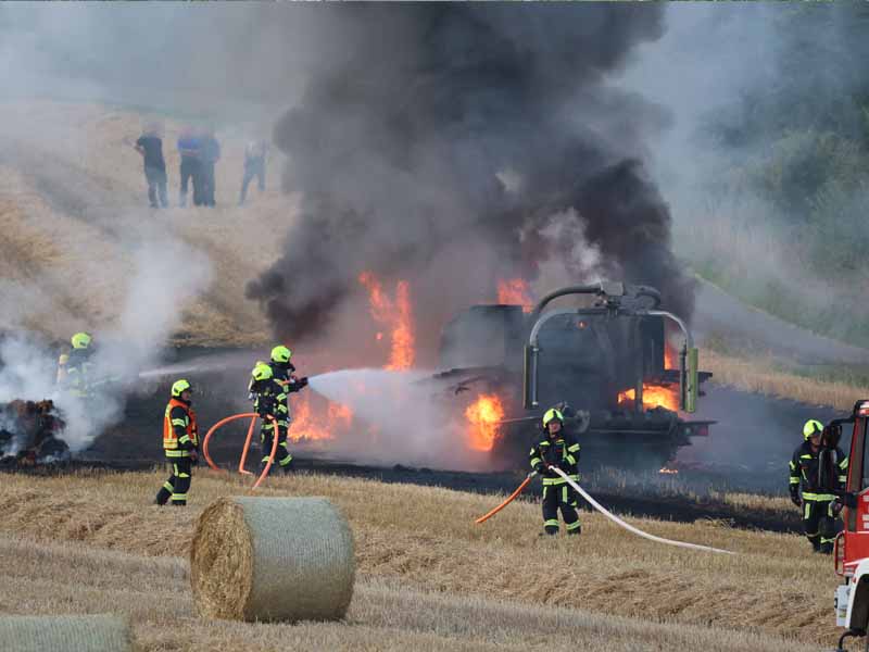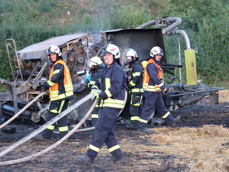 Ein Übergreifen der Flammen auf die benachbarten Waldgebiete konnte dadurch erfolgreich unterbunden werden. Hier zeigte sich erneut, wie wichtig es ist, dass auch die Ortsteilwehren über wasserführende Fahrzeuge verfügen. Parallel begann die Brandbekämpfung unter Atemschutz an dem landwirtschaftlichen Gespann. Aufgrund des fortgeschrittenen Vollbrandes war ein Totalschaden nicht mehr zu verhindern. Alle eingesetzten Einsatzkräfte arbeiten Hand in Hand, die Zusammenarbeit funktionierte reibungslos.