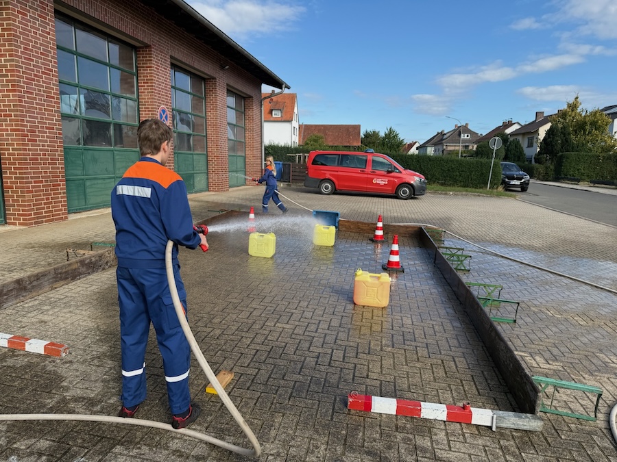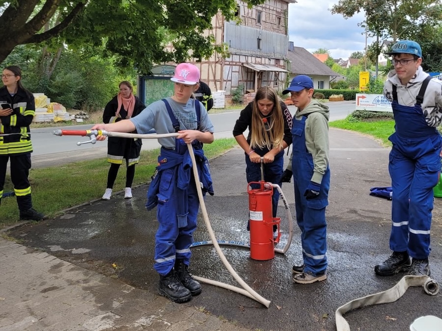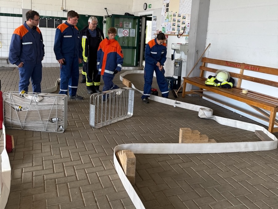 Am Samstagmorgen begannen die Wettbewerbe. Die Jugendlichen mussten zunächst einen Fragebogen zu feuerwehrtechnischem Wissen ausfüllen, für den sie mehrere Wochen geübt hatten. Anschließend folgte die Löschübung (A-Teil). Dabei musste ein Löschangriff mit drei Strahlrohren aufgebaut werden – fehlerfrei und in der vorgegebenen Zeit. Ein Highlight war die Teilnahme einer Jugendwart-Gruppe, die von den Jugendlichen selbst bewertet wurde.