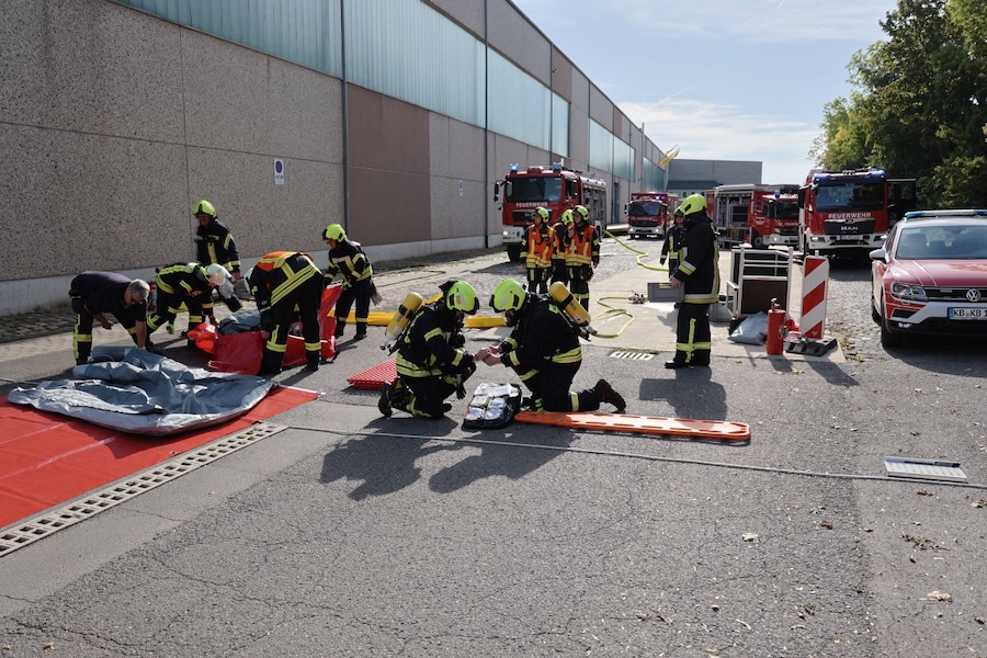 KORBACH. Der Gefahrgutzug der Feuerwehr Korbach hat eine Ausbildungseinheit unter Einsatzbedingungen absolviert; angenommen wurde ein Beladungsunfall auf einem Speditionsgelände.