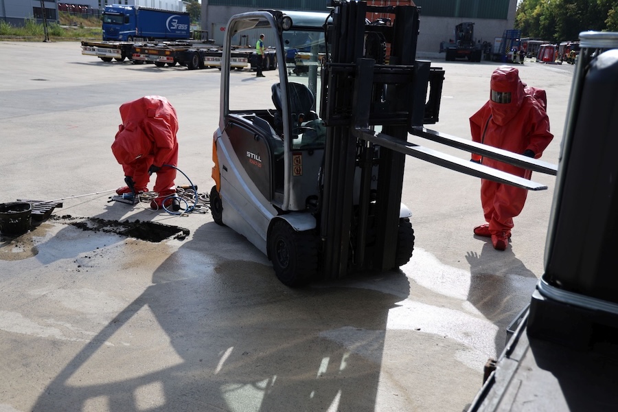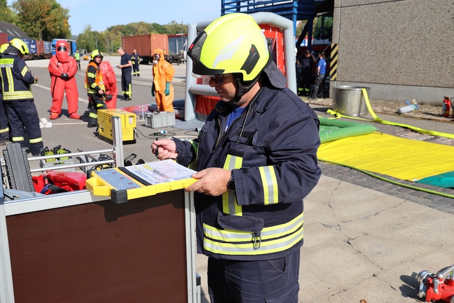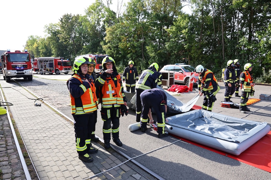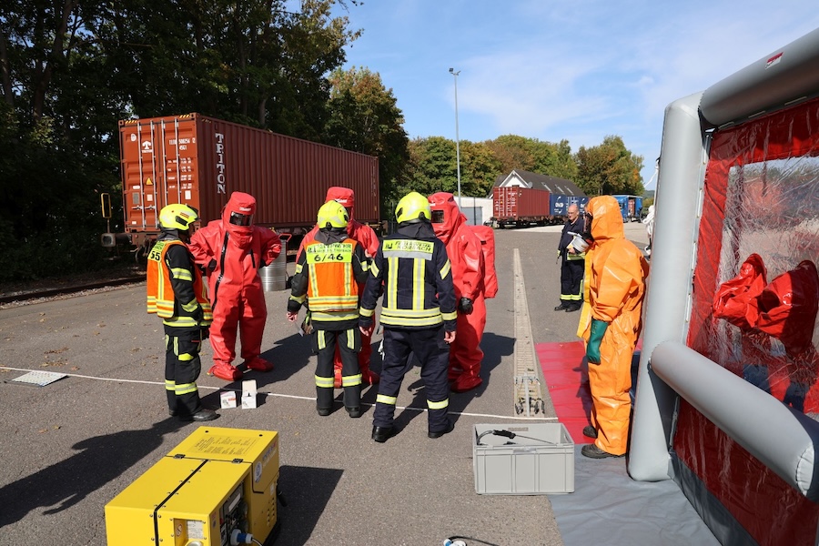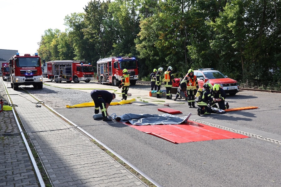 Am Samstagvormittag, 20. September, starteten die ehrenamtlichen Kräfte mit mehreren Spezialfahrzeugen per Alarmanfahrt vom Stützpunkt am Südring zum Übungsobjekt am Güterbahnhof. Ein Staplerfahrer hatte beim Rangieren einen Kanister auf der Ladefläche eines Gefahrgut-Lkw beschädigt und sich dabei verletzt.