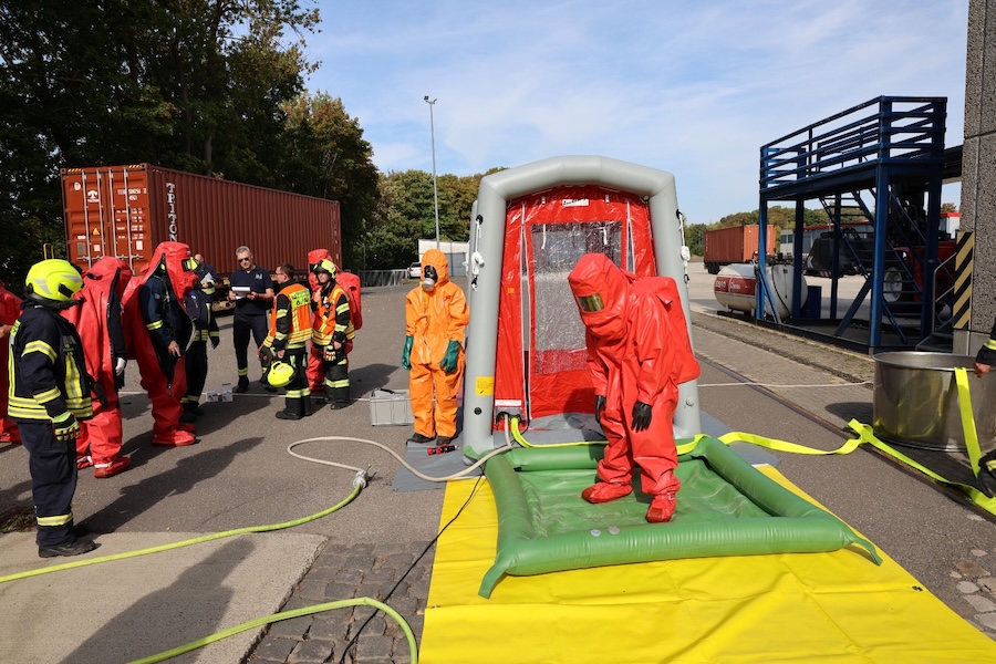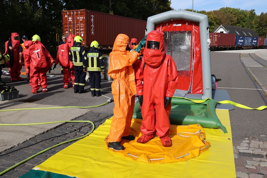 Arbeit im Vollschutz bedeutet eine hohe körperliche Belastung; entsprechend wurden Einsatzzeiten eng überwacht und dokumentiert. Im Anschluss passierten alle eingesetzten Kräfte die Dekontaminationsschleuse. Dort wurden die Anzüge grob gereinigt und abgelegt; eine spezielle Dekon-Dusche war aufgebaut.