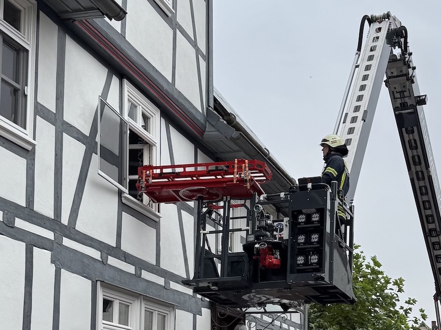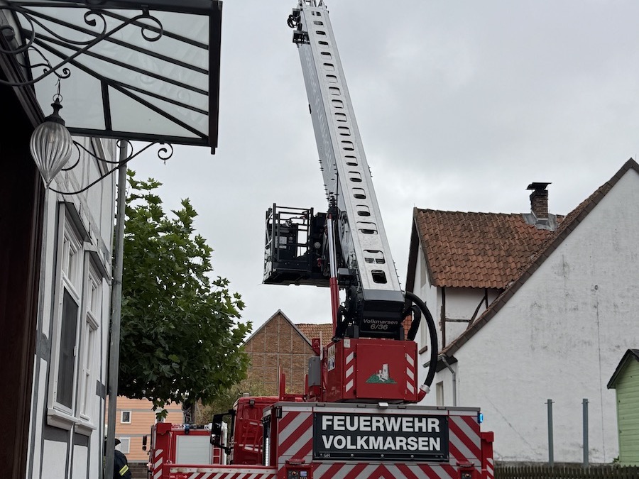 VOLKMARSEN. Menschenrettung aus einem Obergeschoss mit Hubarbeitsbühne; die Person wurde schonend gerettet und dem Rettungsdienst übergeben.