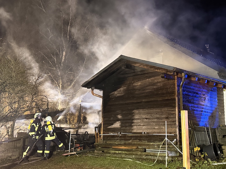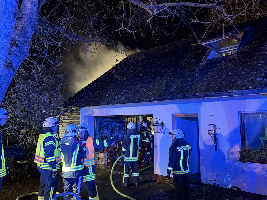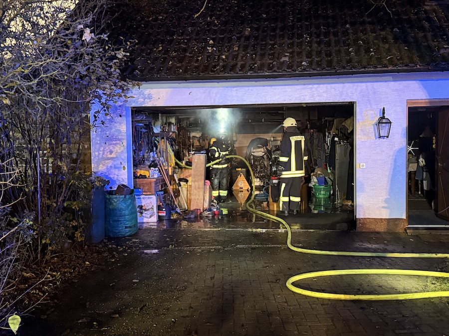Schnelles Vorgehen der ersten Trupps verhinderte ein Übergreifen auf den Dachstuhl der Garage; in Mitleidenschaft gezogen wurde lediglich der Dachüberstand. Das Wohnhaus blieb dank Belüftungsmaßnahmen rauchfrei und bewohnbar. Teile des Garagendachs wurden geöffnet, um den Dachstuhl zu kontrollieren. Glutnester suchten die Kräfte mit Wärmebildkamera, bei den Nachlöscharbeiten kam F500-Löschmittel zum Einsatz.