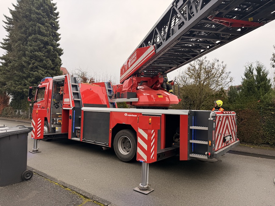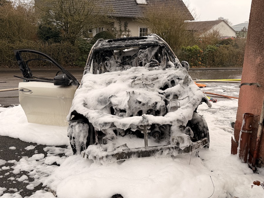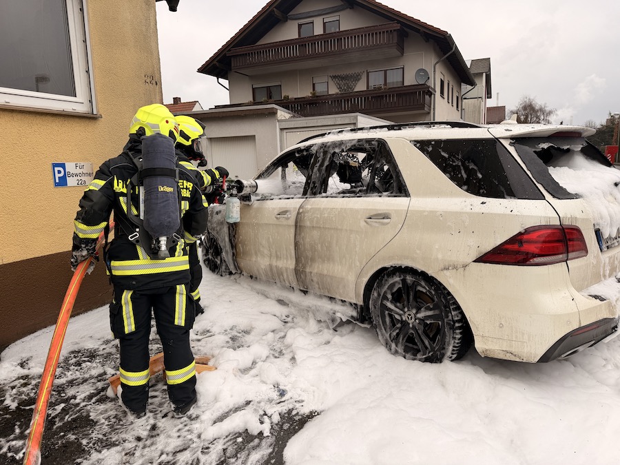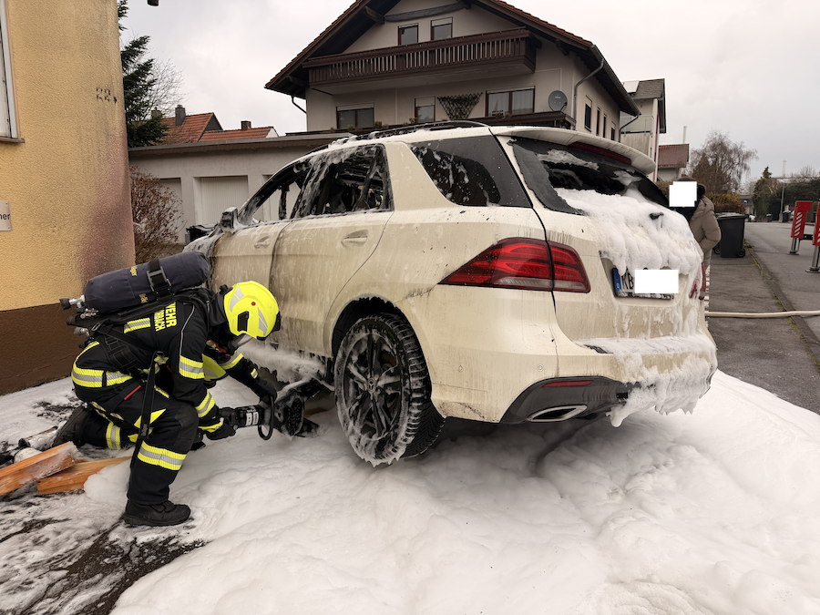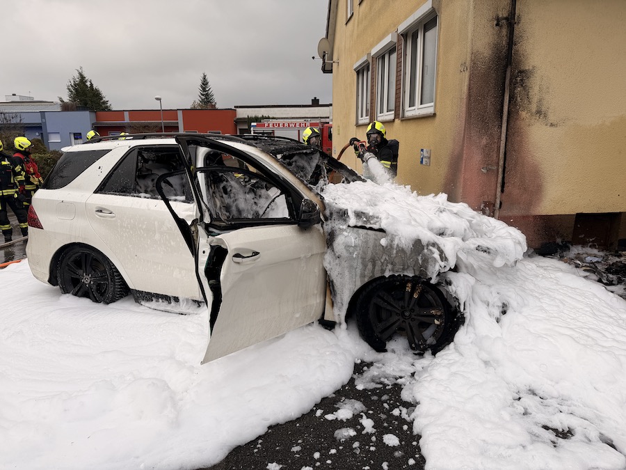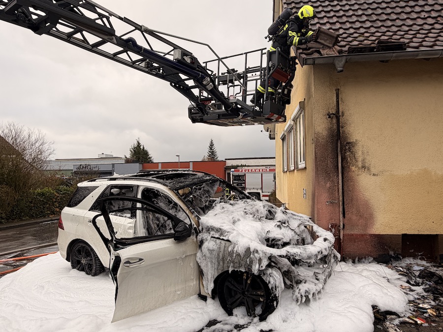 Beim Eintreffen der ersten Kräfte stand der Frontbereich des Fahrzeugs bereits im Vollbrand, die Flammen hatten auf die Fassade, den Dachüberstand sowie auf dort abgestellte Mülltonnen übergegriffen. Durch einen raschen Löscheinsatz konnte der Brand durch zwei Trupps unter Atemschutz schnell unter Kontrolle gebracht werden, eine weitere Ausbreitung wurde verhindert. Zeitgleich mit der Brandbekämpfung erfolgte die Gebäudekontrolle im Innenbereich, die betroffenen Personen wurden vorsorglich vom Rettungsdienst betreut. Mit der Drehleiter wurde ein Teilbereich der Dachfläche abgedeckt, um versteckte Glutnester zu finden.