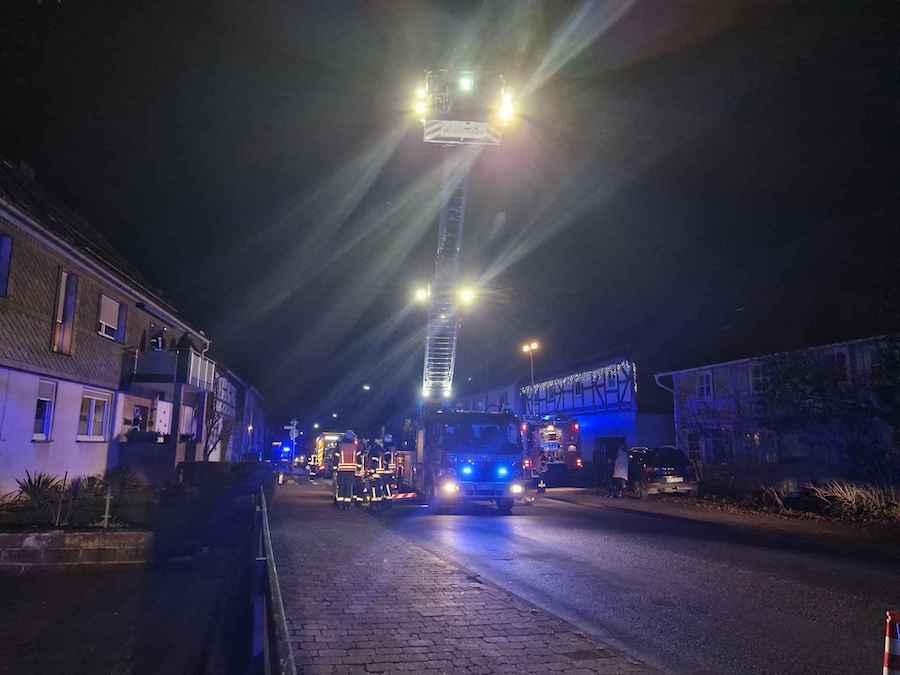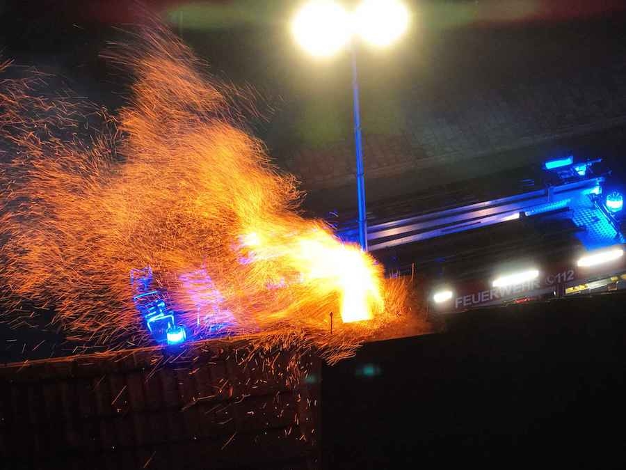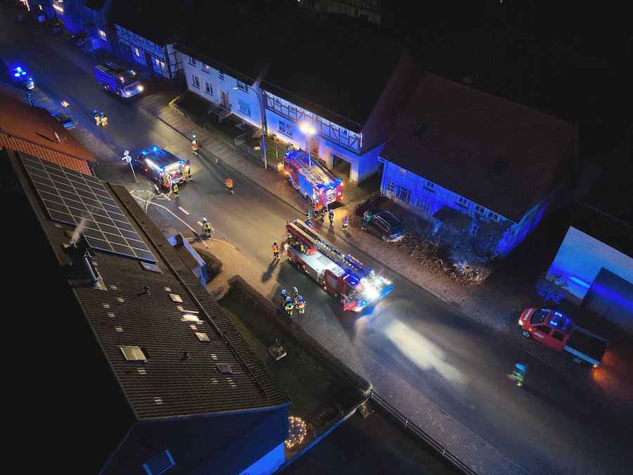 Auf Grundlage der Drohnenbilder und der daraus resultierenden Lagebeurteilung entschied sich die Einsatzleitung, die Drehleiter der Feuerwehr Wolfhagen nachzufordern, um die Dachhaut auf eine mögliche thermische Beeinflussung durch den Funkenflug zu kontrollieren. Nach dem Anleitern am Dachstuhl untersuchten die Wolfhager Kräfte den betroffenen Bereich intensiv und konnten schließlich Entwarnung geben.