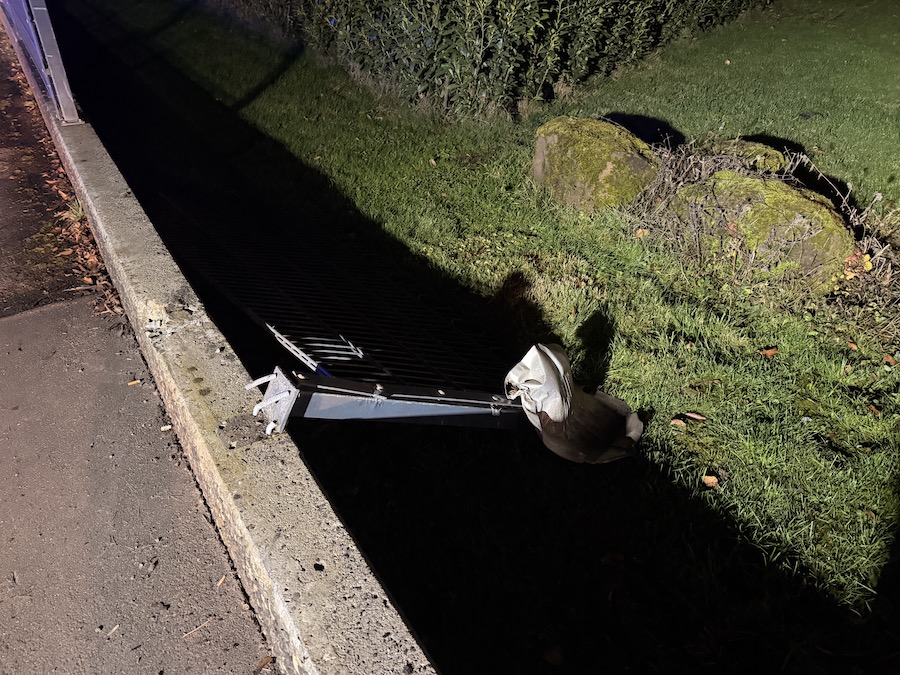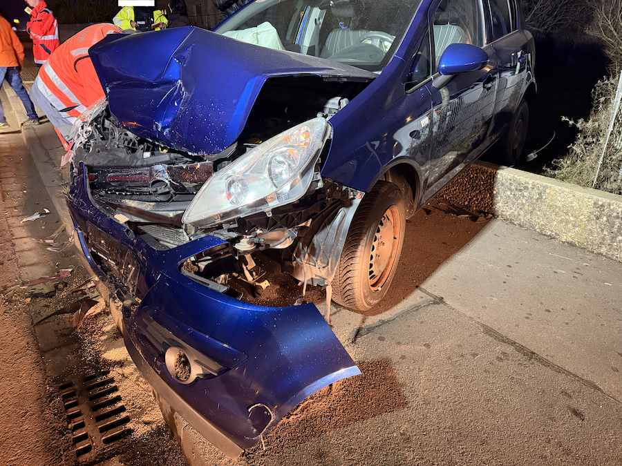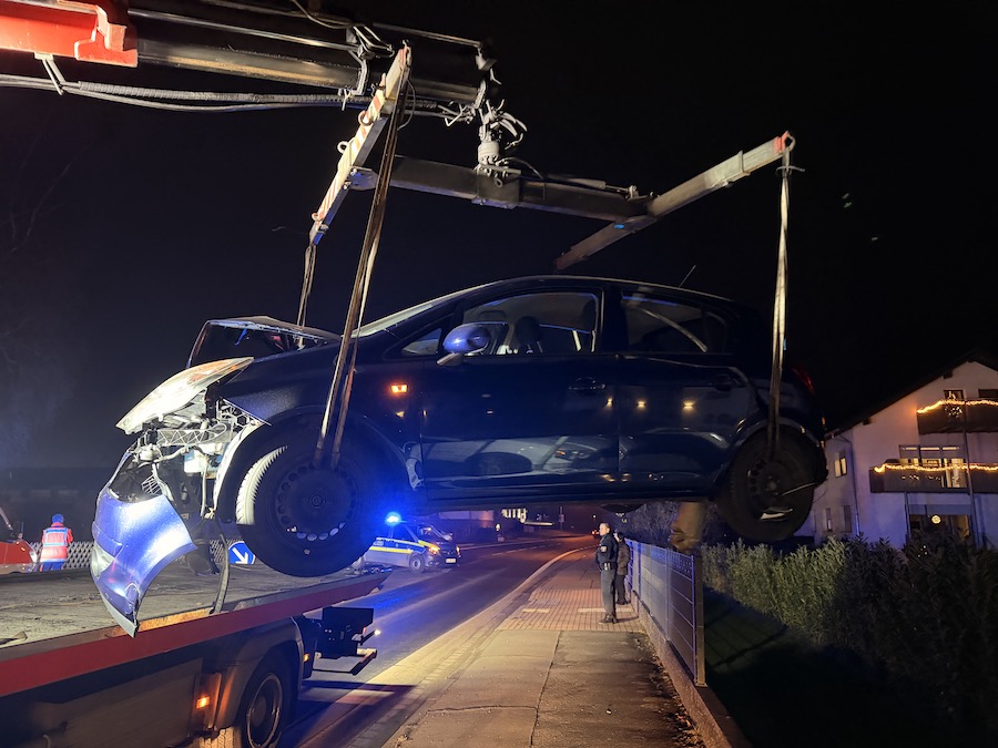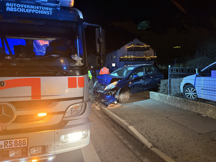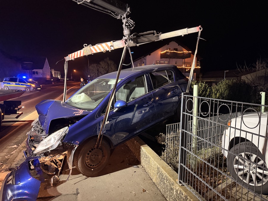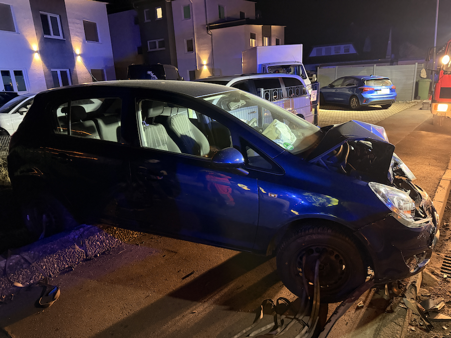Durch die Wucht des Aufpralls wurde der blaue Opel Corsa von der Fahrbahn in einen angrenzenden Garten geschleudert, wobei der dortige Zaun erheblich beschädigt wurde.