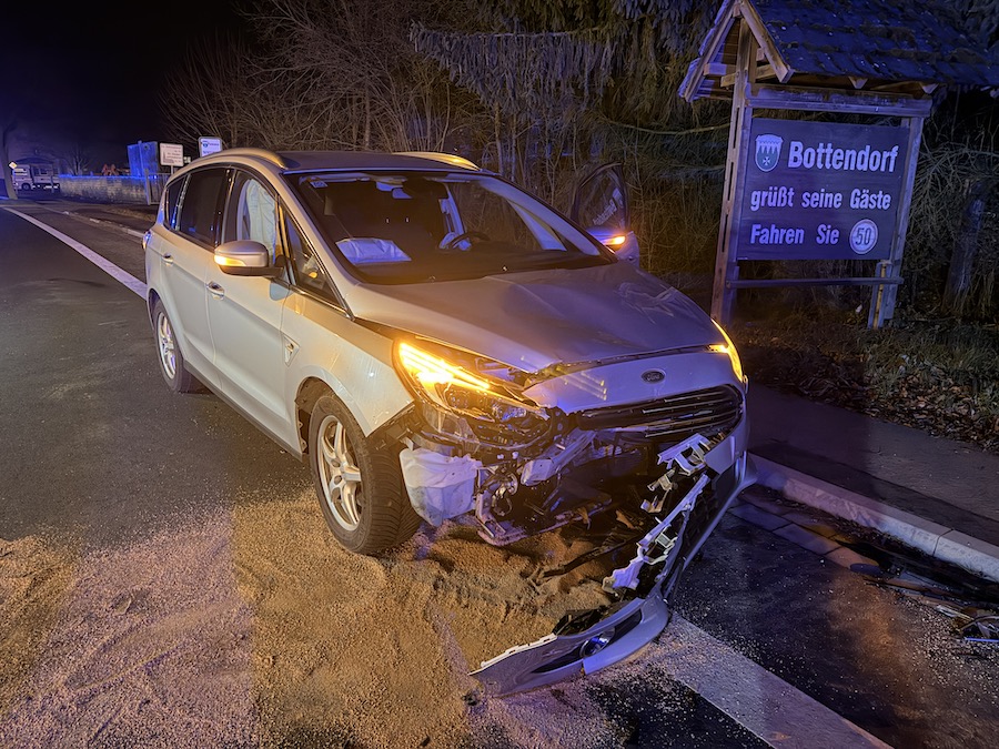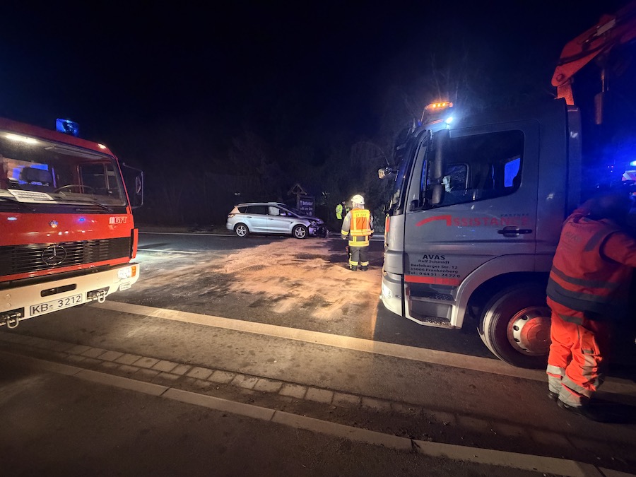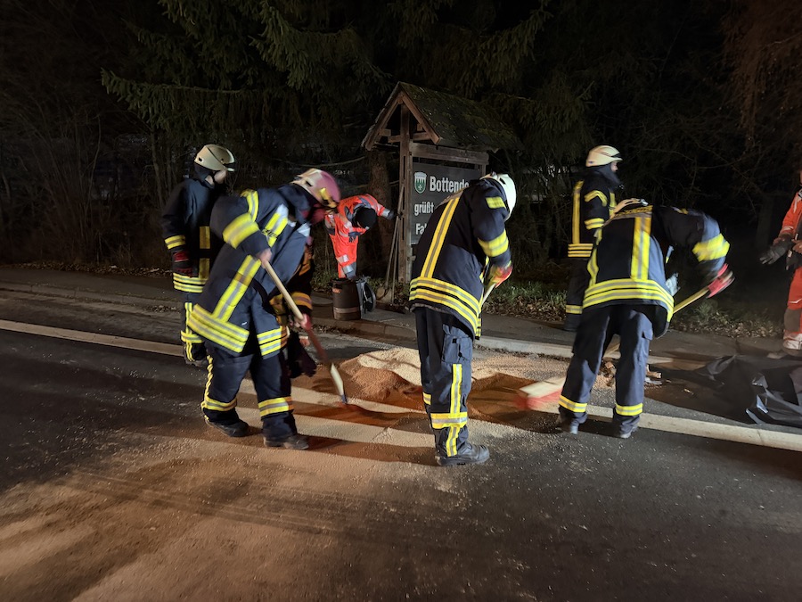 Gegen 18:40 Uhr wurde die Feuerwehr Bottendorf unter dem Stichwort „H1 Ölspur“ alarmiert. Insgesamt neun Einsatzkräfte rückten mit dem Löschgruppenfahrzeug (LF10) und dem Mannschaftstransportwagen aus. Unter der Leitung des stellvertretenden Wehrführers Jannik Vöhl sicherte die Feuerwehr die Einsatzstelle ab, fing auslaufende Betriebsstoffe auf und nahm das Öl auf der Straße mithilfe von Bindemittel auf.