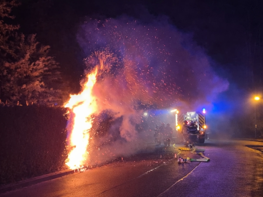 Am Donnerstagmorgen ging der Alarm um 0.03 Uhr bei den ehrenamtlichen Helfern ein. Vermutlich durch gezündetes Feuerwerk hatte die Bepflanzung Feuer gefangen. Unter der Leitung von Stadtbrandinspektor Martin Trost gingen die Kräfte gegen die Flammen vor. Mit einem C-Rohr und Wasser konnte der Brand zügig abgelöscht werden.