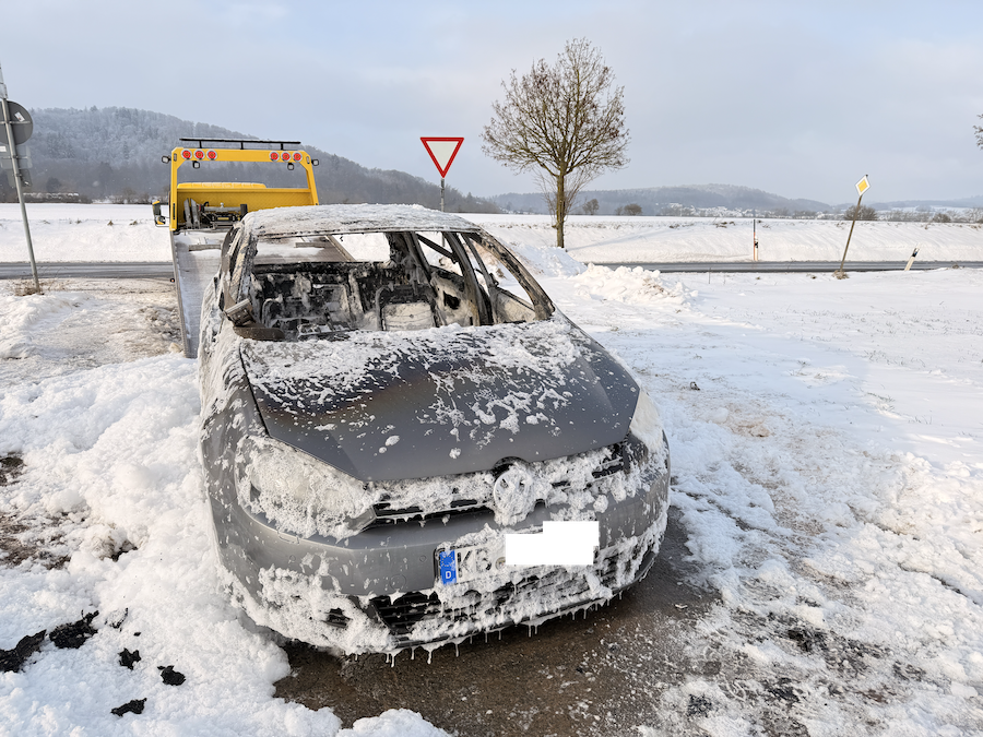 KORBACH. Zu einem Pkw-Brand auf der Landesstraße 3076 zwischen Korbach und Nordenbeck kam es am Samstagvormittag. Gegen 11.00 Uhr am Samstag, 10. Januar, befuhr ein Fahrer aus Lichtenfels mit seinem VW Golf die Strecke, als das Fahrzeug aufgrund eines vermuteten technischen Defekts plötzlich in Brand geriet. Geistesgegenwärtig lenkte der Fahrer seinen Wagen noch in einen angrenzenden Feldweg, bevor er das brennende Fahrzeug verlassen konnte.
