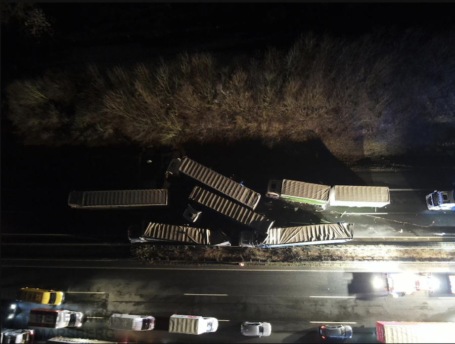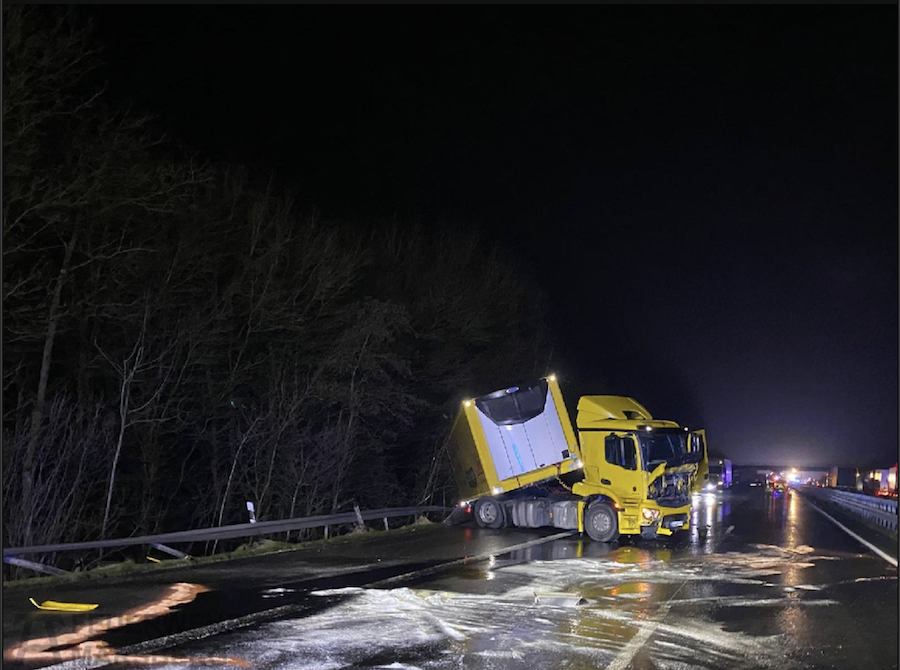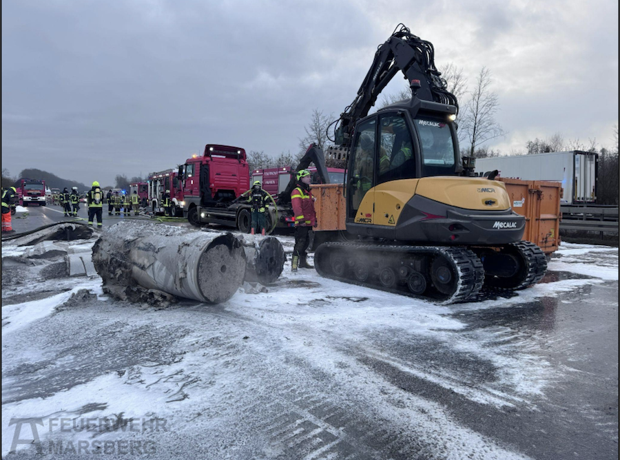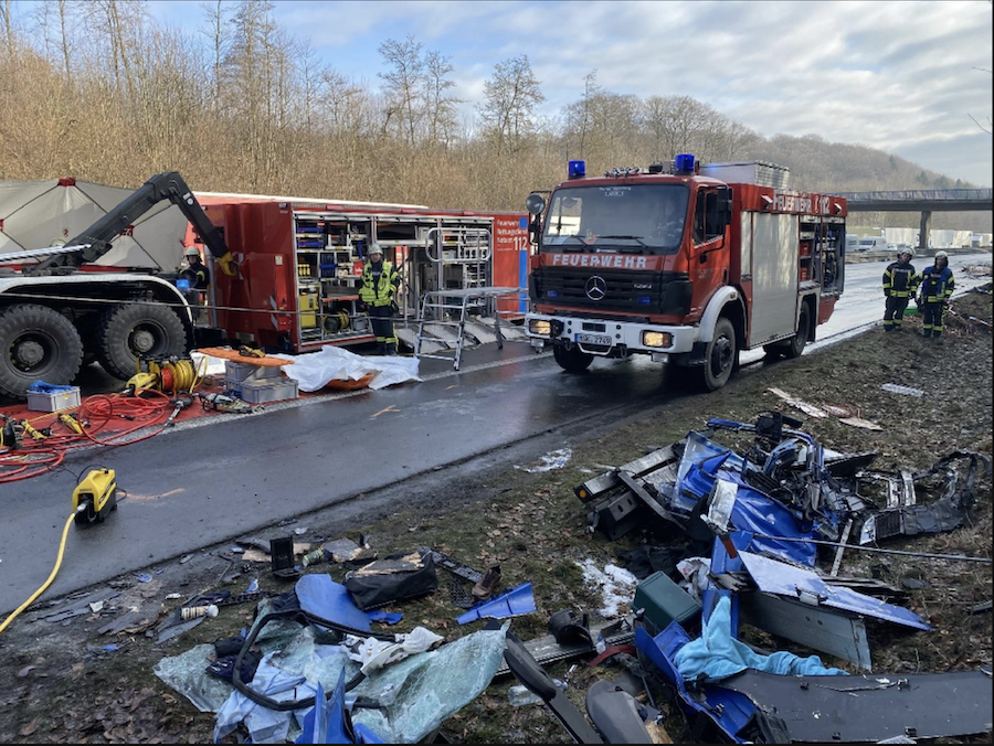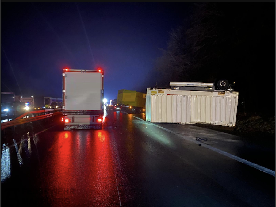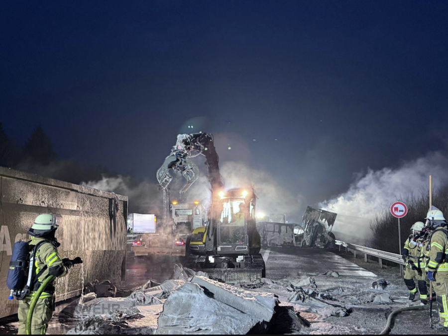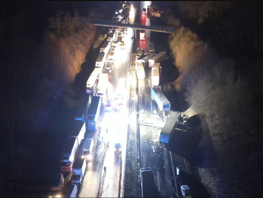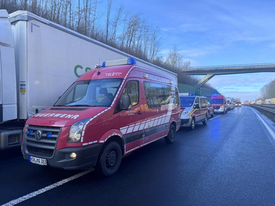 Beteiligt waren an den umfangreichen Maßnahmen zudem die untere Wasserbehörde, die Straßenmeisterei mit speziellen Reinigungsfahrzeugen sowie kommunale Streudienste auf den Zuwegen. Spezialfirmen mit Kränen und Baggern unterstützten die Einsatzkräfte bei der Bergung der teils umgestürzten oder überschlagenen Lkw.