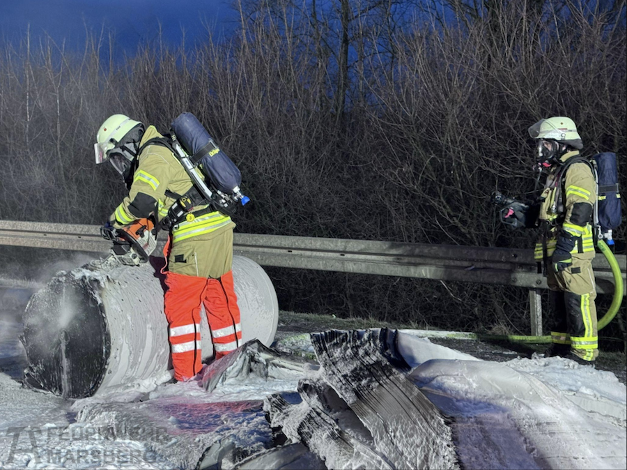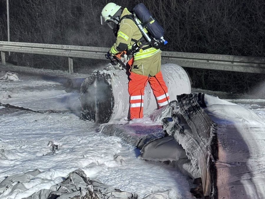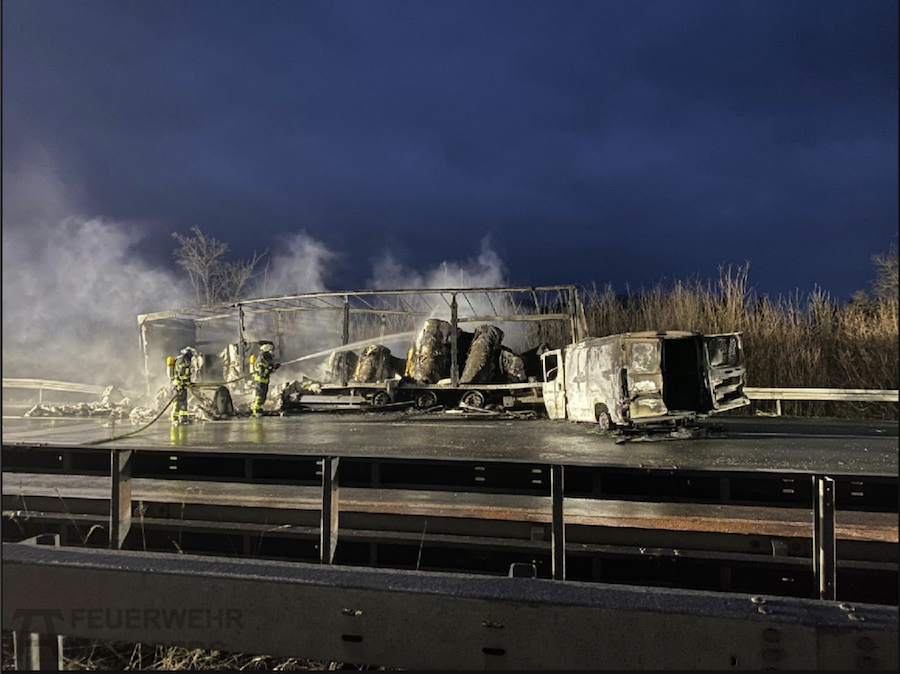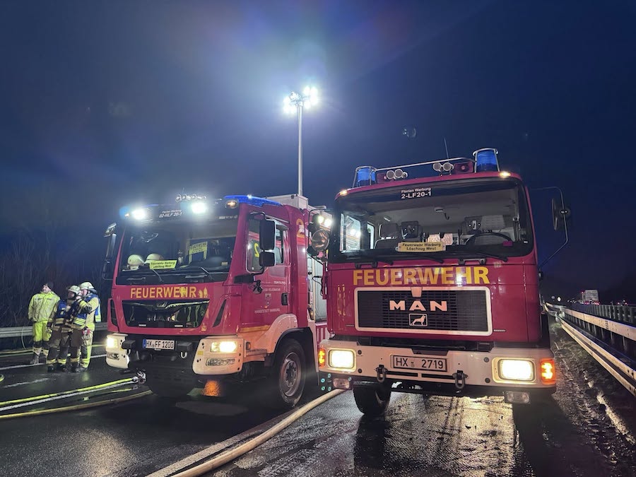 Gemeldet wurde der erste folgenschwere Zusammenstoß gegen 01.30 Uhr am Freitag (23. Januar 2026) in Fahrtrichtung Dortmund, als ein 48-jähriger Bielefelder mit einem 3,5-Tonnen-Lkw auf einen am Seitenstreifen abgestellten Sattelauflieger auffuhr. Infolge der massiven Kollision geriet der mit Papier beladene Sattelzug unmittelbar in Vollbrand, wobei der 48-jährige Fahrer des auffahrenden Lastwagens noch an der Unfallstelle verstarb.