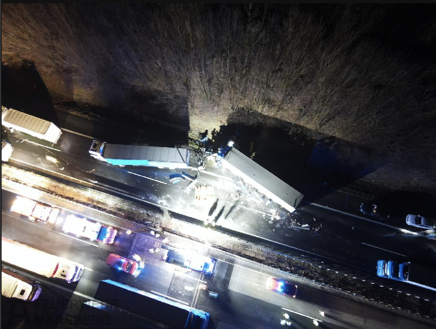 Ereignet hat sich ein weiterer tragischer Unfall gegen 02.30 Uhr ebenfalls in Fahrtrichtung Kassel, bei dem zwei weitere Personen ihr Leben verloren. Ein Lkw-Fahrer beabsichtigte, vom rechten auf den linken Fahrstreifen zu wechseln, um einen in Schrittgeschwindigkeit fahrenden Pkw zu überholen, wobei der Lastwagen zunächst den Pkw leicht touchierte und anschließend auf dem linken Fahrstreifen auf einen anderen Lkw aufprallte. In dem auffahrenden Fahrzeug, das zunächst fälschlicherweise als Pkw gemeldet worden war, erlitten der 60-jährige Fahrer und sein 63-jähriger Beifahrer – beide italienische Staatsangehörige – tödliche Verletzungen.