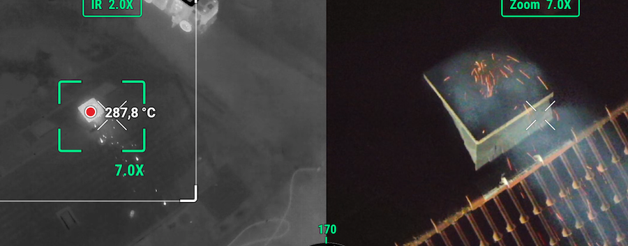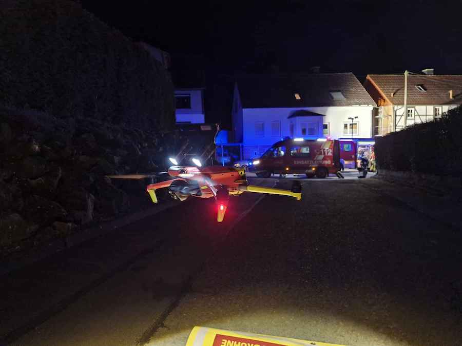 Mittels Wärmebildkamera an einer Drohne wurden Temperaturen von über 300°C gemessen, wobei eine thermische Aufbereitung am Dachstuhl noch nicht vorlag. Parallel wurde die Einsatzstelle ausgeleuchtet, bevor ein verständigter Schornsteinfeger den Kamin kehrte.