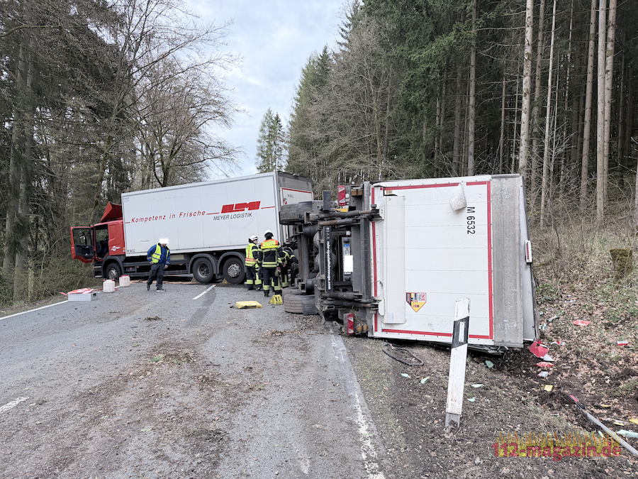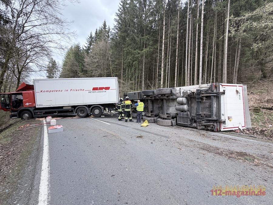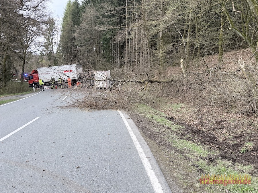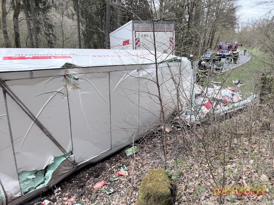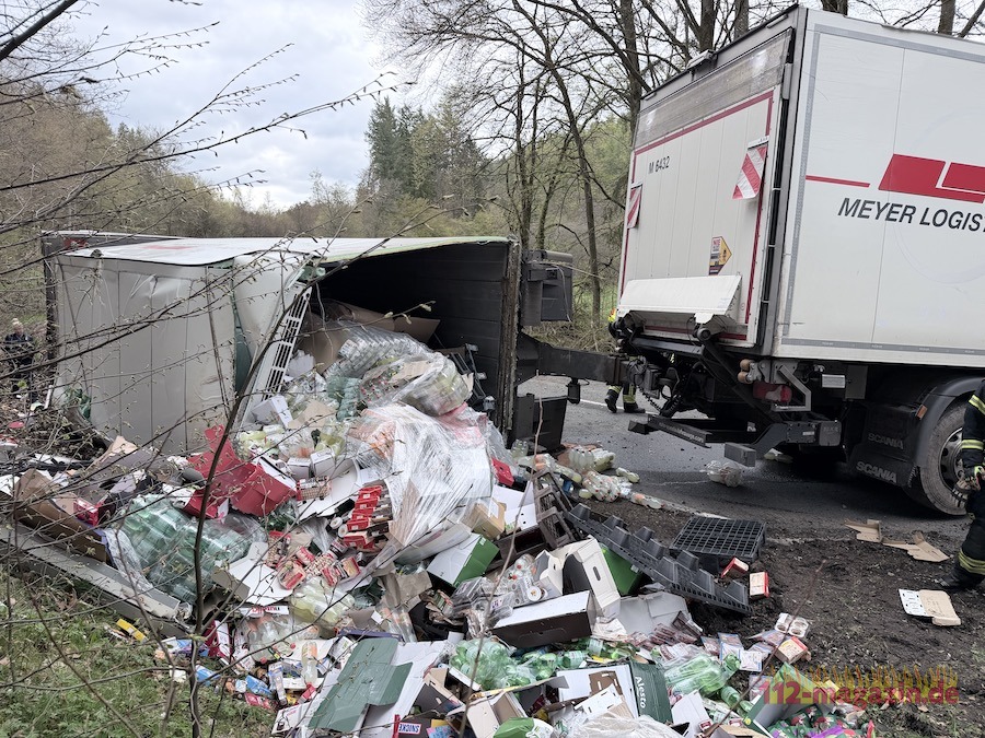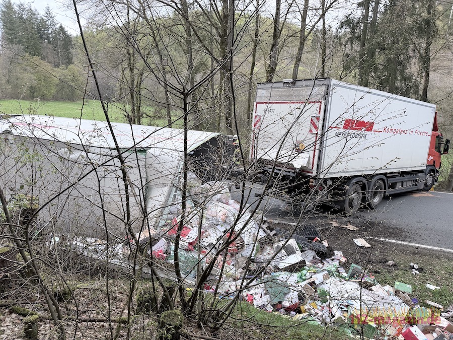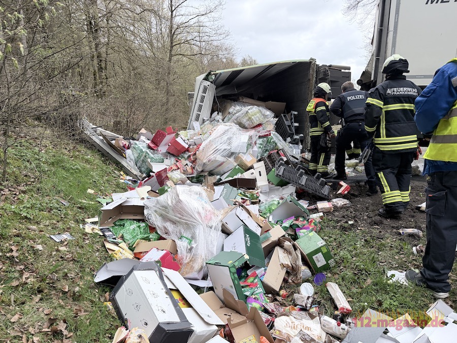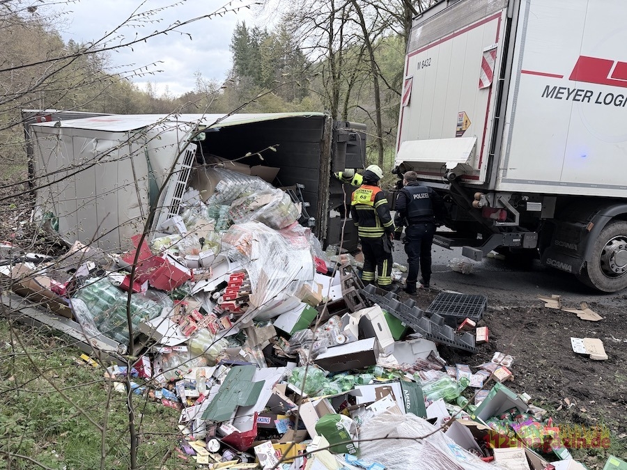 Gegen 16 Uhr war ein 60-jähriger Fahrer aus Kassel mit dem leeren Lkw und einem stark beladenen Anhänger unterwegs. In einer Linkskurve begann das Gespann zu schlingern, prallte gegen einen Baum und der Anhänger kippte um. Zahlreiche Lebensmittelwaren verteilten sich daraufhin auf der Fahrbahn und im angrenzenden Graben.