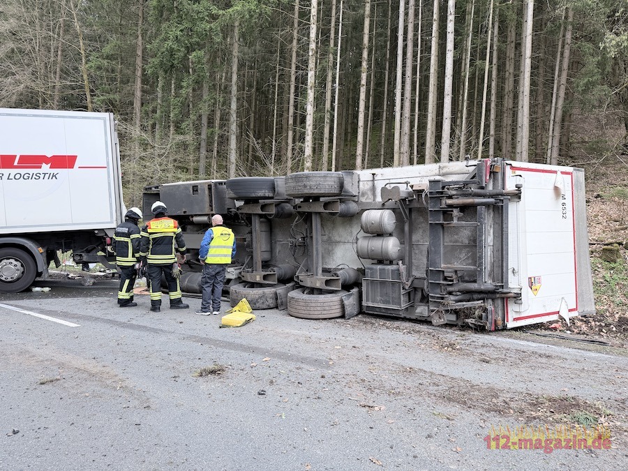 FRANKENBERG. Ein umgestürzter Lastwagenanhänger hat die Landesstraße 3073 zwischen Somplar und Frankenberg am Montagnachmittag komplett blockiert. Wegen einer fehlerhaften Beladung geriet der Lkw mit Anhänger in einer Kurve außer Kontrolle, kippte um und verteilte seine Ladung großflächig auf der Fahrbahn.