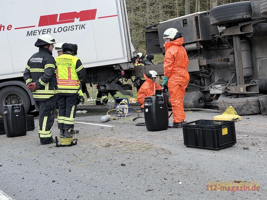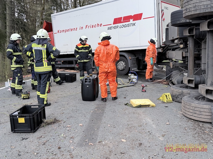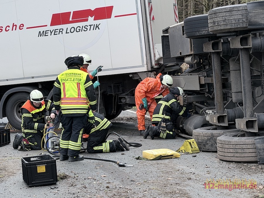 14 Einsatzkräfte der Frankenberger Feuerwehr unter der Leitung von Stadtbrandinspektor Martin Trost sicherten die Unfallstelle, streuten ausgelaufenen Diesel ab und pumpten den Tank des Anhängers leer. Hessen Mobil sperrte die Landesstraße weiträumig ab. Ein Abschleppdienst aus Schwalmstadt wurde zur Bergung des umgestürzten Anhängers angefordert.