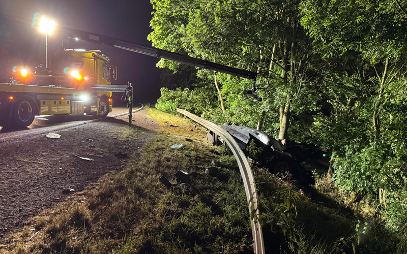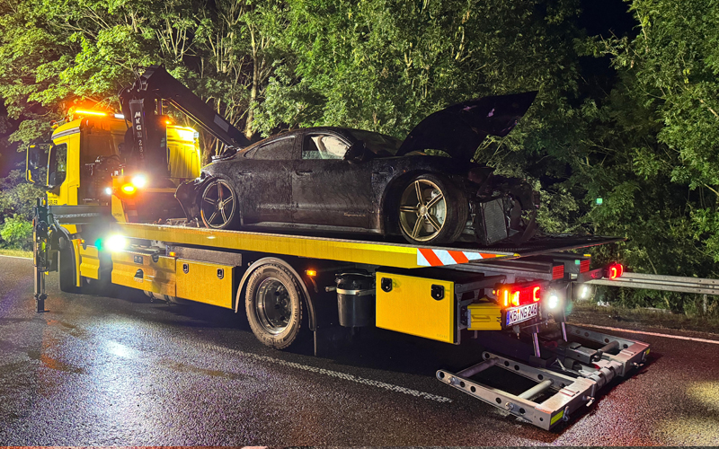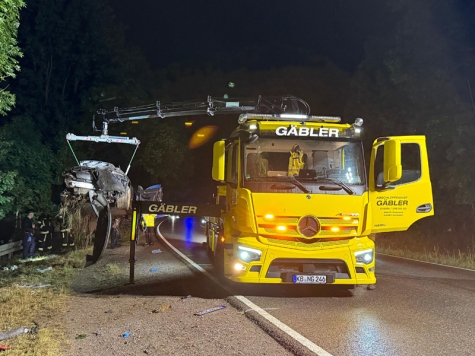 Die Firma Gäbler musste in den frühen Morgenstunden ausrücken, um den E-Porsche aus dem Hang zu heben und der Entsorgung zuzuführen.