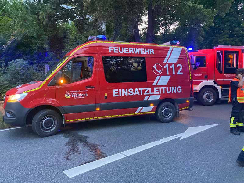 Um 19.44 Uhr wurden die Feuerwehren Waldeck und Sachsenhausen zu einem Verkehrsunfall auf der Bundesstraße bei Waldeck-Ost alarmiert. Durch eine parallel stattfindende Drohnenausbildung in der Nähe, traf die Besatzung des Einsatzleitwagens kurz nach der Alarmierung ein, übernahm die Betreuung der Patienten sowie die weitere Erkundung und Koordination. Insgesamt waren drei Personen verletzt, die durch den Rettungsdienst behandelt wurden. Zwei stark beschädigte PKWs sowie ein LKW waren unfallbeteiligt. Eingeklemmt war niemand mehr. Schnell konnte eine Verkehrsabsicherung hergestellt und der Brandschutz sichergestellt werden. Auslaufende Betriebsstoffe wurden aufgenommen. Außerdem klemmten die Freiwilligen die Fahrzeugbatterien ab. Um an diese heranzukommen, setzten die Waldecker Einsatzkräfte den hydraulischen Spreizer ein. In Absprache mit der Polizei sollte mithilfe der am Hilfeleistungstanklöschfahrzeug verbauten maschinellen Zugeinrichtung ein Unfallauto von der Gegenfahrbahn entfernt werden, um einen schnellen Verkehrsfluss wiederherzustellen. Mit der Drohne machten die Feuerwehrleute auf Anfrage der Polizei Luftaufnahmen von der Unfallstelle. Nachdem die Fahrzeuge durch ein Bergungsunternehmen abtransportiert waren, konnte der Einsatz beendet werden. Insgesamt waren 35 Feuerwehrleute ca. 90 Minuten im Einsatz.