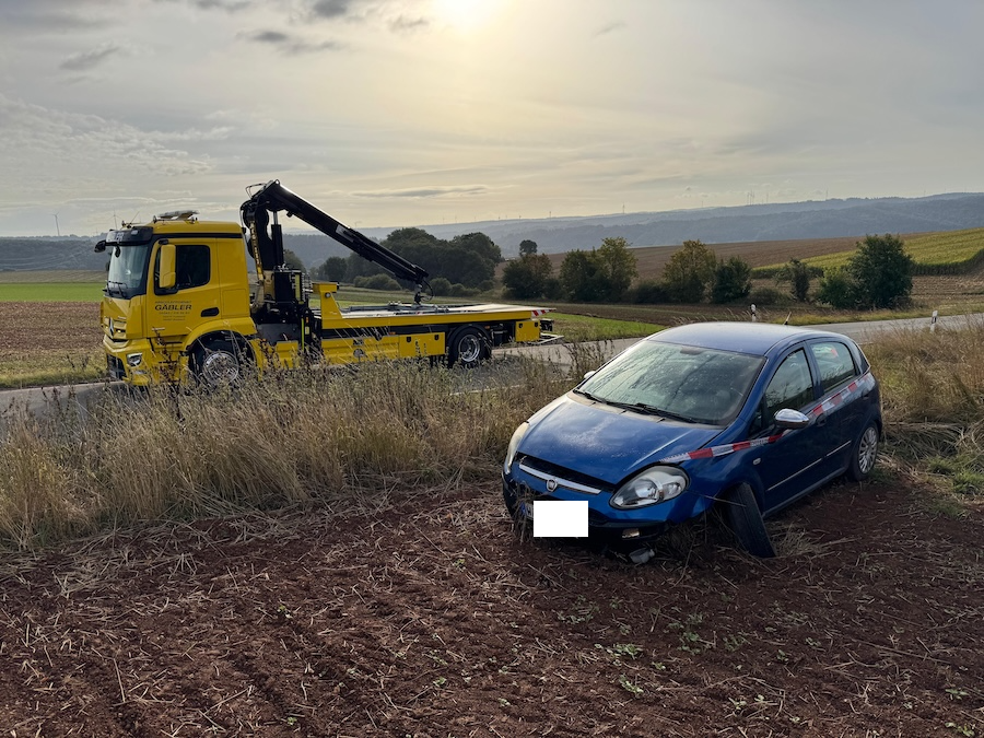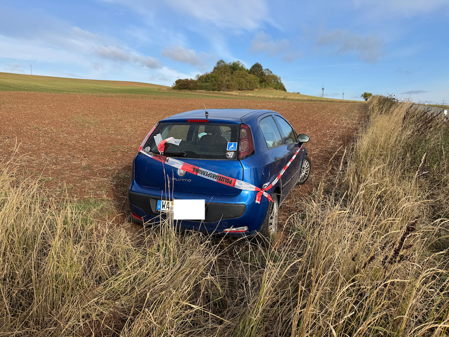 TWISTETAL. Auf der L 3295 zwischen Mühlhausen und Gembeck kam ein blauer Fiat Punto nach links von der Fahrbahn ab und blieb auf einem Acker stehen.