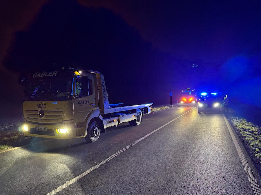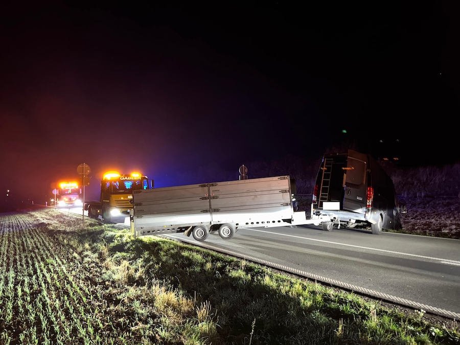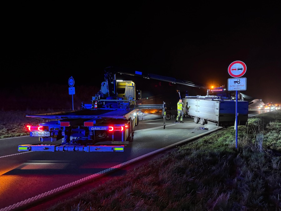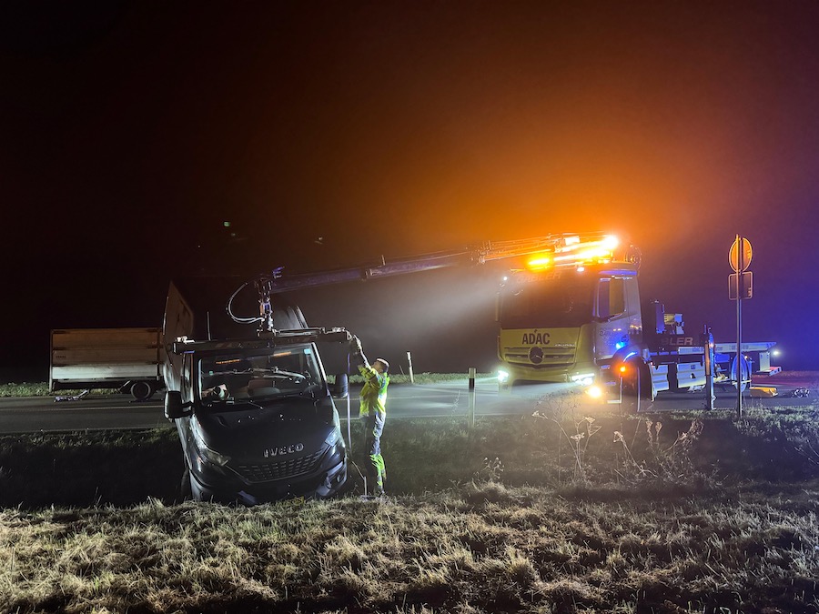 Dabei wurden der Iveco und der Anhänger beschädigt. Die Firma Gäbler wurde beauftragt, das Gespann von der Fahrbahn zu heben; der Schwerlasttransport für die Windkraftanlagen stand bis zum Abschluss der Maßnahmen.