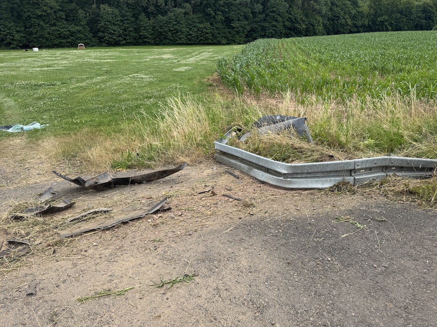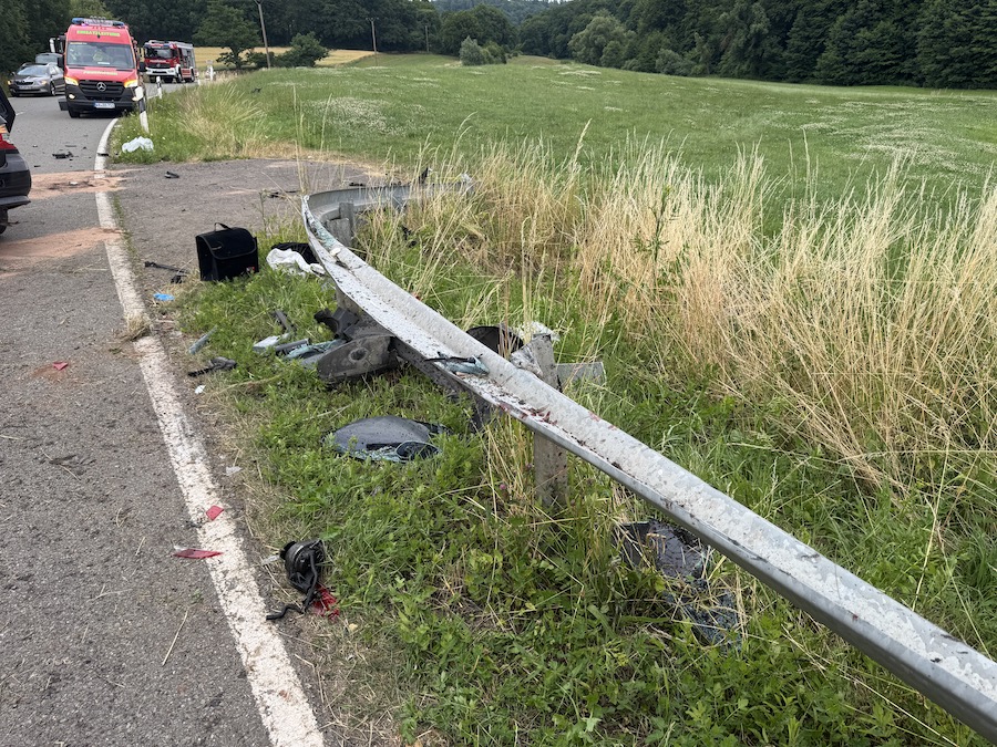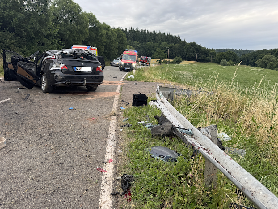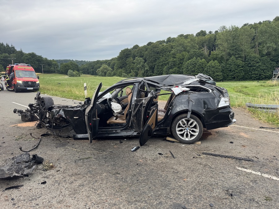 Der Unfall ereignete sich am Samstag, 5. Juli, gegen 17.10 Uhr. Nach Angaben der Polizei kam der BMW in einer langgezogenen Linkskurve nach rechts von der Fahrbahn ab. Das Fahrzeug durchfuhr den Straßengraben auf rund 145 Metern, prallte gegen eine Leitplanke und wurde durch die Wucht des Aufpralls in die Luft geschleudert. Der Wagen überschlug sich mehrfach und kam völlig zerstört mittig auf der Fahrbahn zum Stehen.