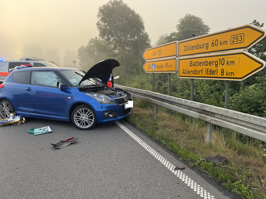 Wie die Polizei gegenüber 112-Magazin mitteilte, wollte eine 27-jährige Frau aus Frankenberg am Donnerstag, 17. Juli 2025, gegen 5.35 Uhr mit ihrem blauen Suzuki von der L 3073 aus Richtung Röddenau kommend nach links auf die B 253 in Richtung Korbach abbiegen. Dabei übersah sie einen vorfahrtsberechtigten Ford Fiesta, der von einem 24-jährigen Mann aus Frankenberg gesteuert wurde und auf der B 253 aus Richtung Frankenberg in Richtung Allendorf unterwegs war.