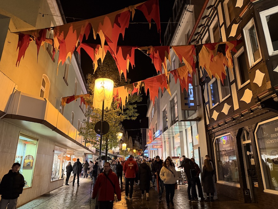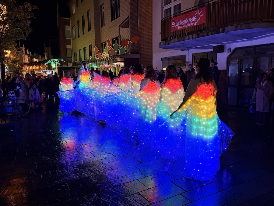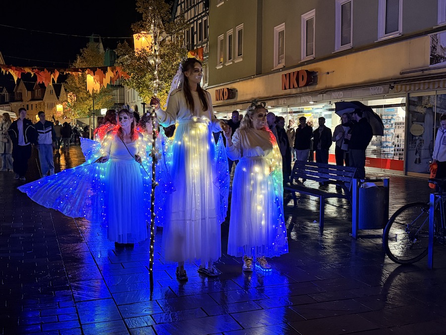 Musikalisch begleiteten Straßenmusiker den Abend vor den Cafés, Walking-Acts vom Dino-Kostüm bis zu Gruselmasken sorgten für Begegnungen und Schnappschüsse. Ein Hingucker war die LED-Showgruppe: Leuchtende Flügel zogen mehrfach durch die Innenstadt und tauchten das nasse Pflaster in kräftige Farben – ein Motiv, das viele Besucher anzog.