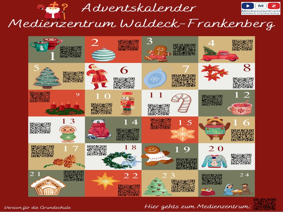 Von Weihnachtsgeschichten bis hin zu Wissensimpulsen: Sowohl für die Grund- als auch für die weiterführenden Schulen hat das Medienzentrum ein spannendes und interessantes Paket mit 24 Lernmedien und Filmen zusammengestellt, das für die Schulen ab dem 1. Dezember Tag für Tag online freigeschaltet wird. Mittels QR-Code können die einzelnen Module digital abgerufen werden.