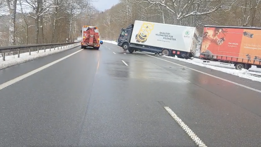 Ein 54-jähriger Fahrer aus Köln war am 2. Januar mit seinem Lastzug einer Firma aus Ludwigsburg zunächst auf einen Parkplatz zwischen Ederbringhausen und Schmittlotheim aufgefahren. Als der Mann gegen 11.45 Uhr seine Fahrt fortsetzen wollte, erkannte er im dichten Schneetreiben die reguläre Ausfahrt nicht. Das Gespann geriet etwa zehn Meter abseits des Asphalts in den angrenzenden Graben. Während sich die Zugmaschine noch teilweise vorwärst auf die Fahrbahn ziehen konnte, blieb der Anhänger im weichen Untergrund stecken.