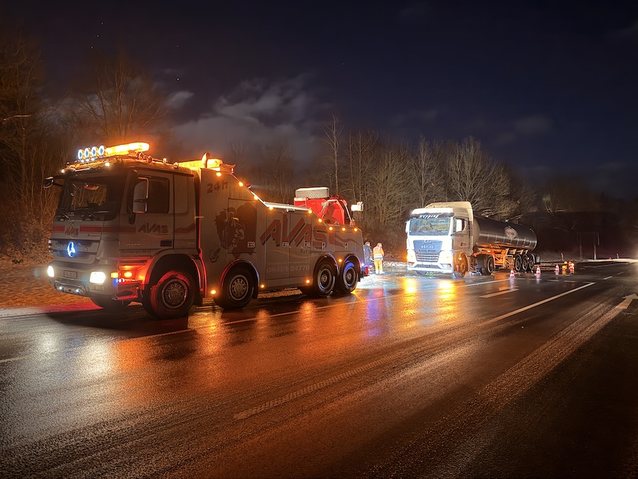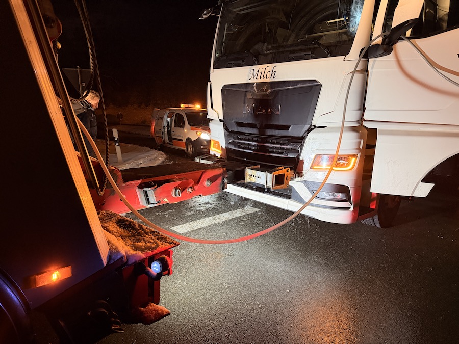 Für die Bergung des liegengebliebenen Milchlasters wurde die Firma AVAS angefordert, die das Gespann abschleppte. Gegen 20.30 Uhr war der Bereich schließlich vollständig geräumt und die Fahrbahn wieder frei für den Verkehr.