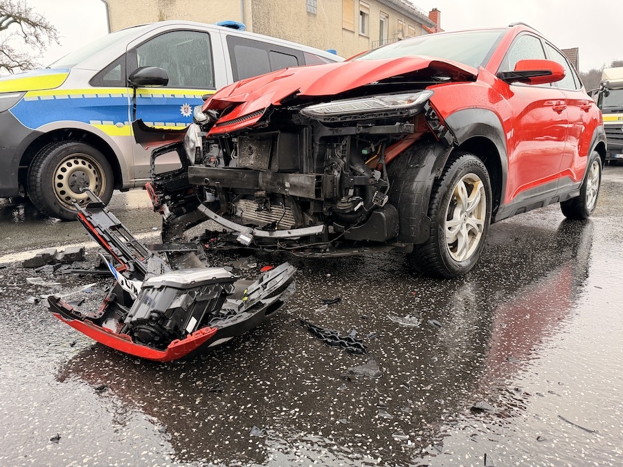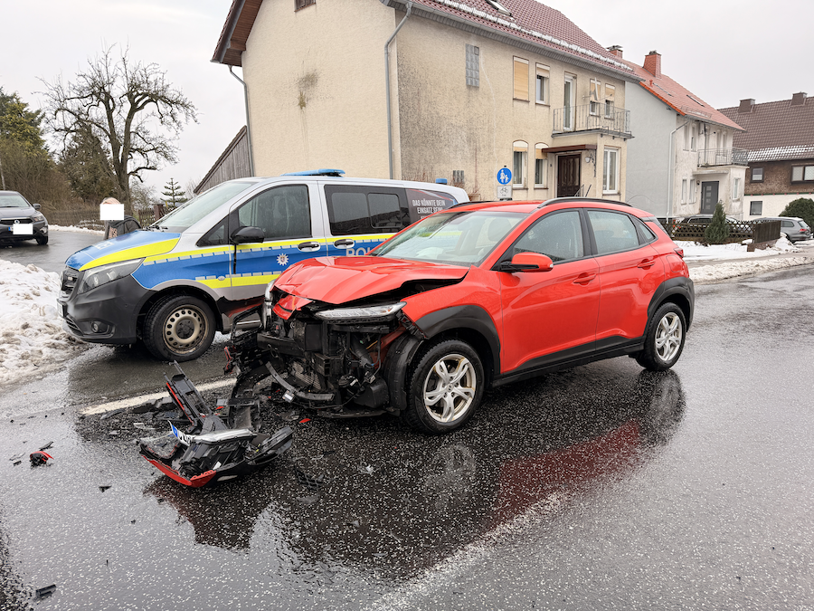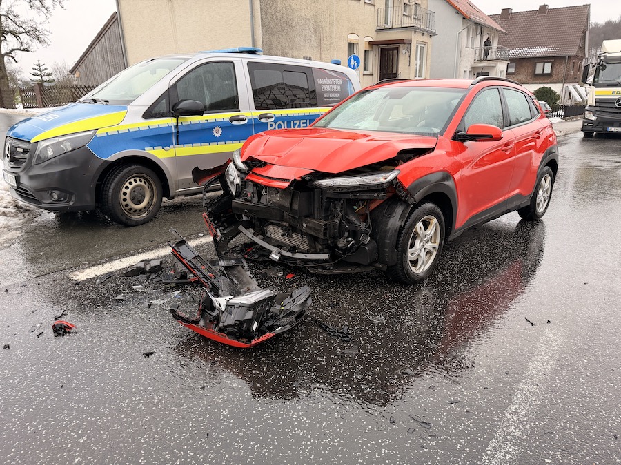 Aus Richtung Bad Wildungen kam zeitgleich eine 38-jährige Frau aus Bergkamen mit ihrem orangefarbenen Hyundai Kona entgegen. Im Einmündungsbereich kam es zur heftigen Kollision der beiden Fahrzeuge, als der Renault den Fahrweg des entgegenkommenden Hyundais kreuzte. Die Wucht des Aufpralls war so stark, dass an beiden Fahrzeugen massiver Sachschaden entstand.